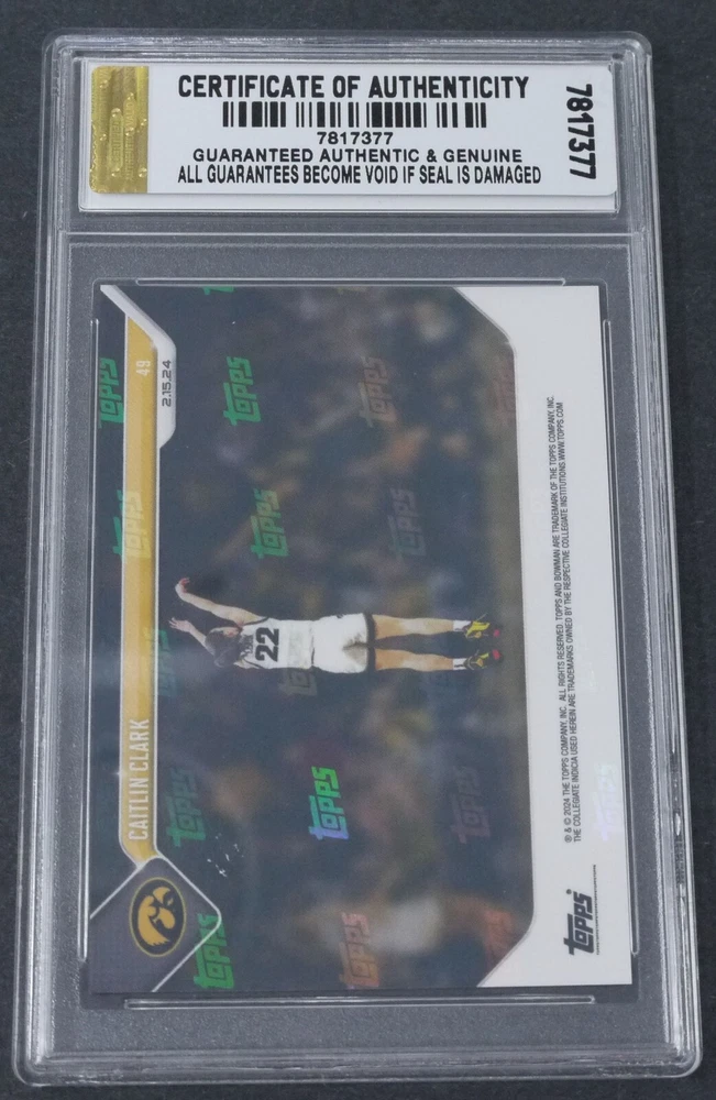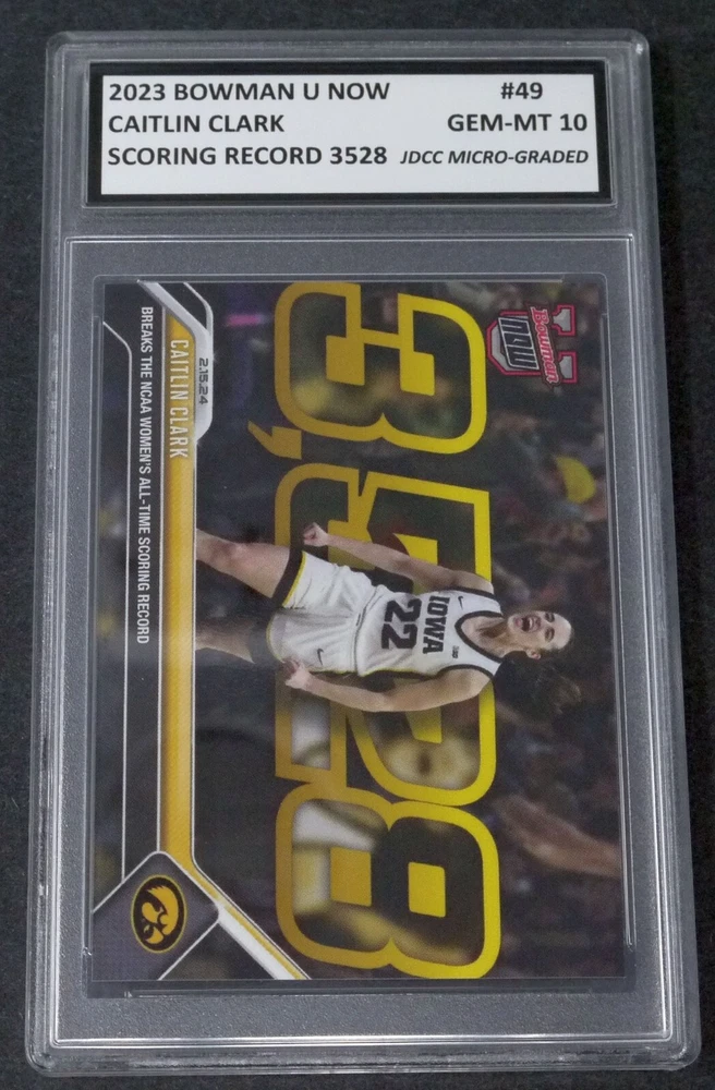 This is a rare and valuable 2023 Bowman U Now #49 Caitlin Clark Scoring Record trading card. The card features the Iowa Hawkeyes player in her breaking sport uniform and is an original, licensed reprint from the manufacturer, Bowman. The card is part of the 2023 Bowman set and has a card number of 49. The card is perfect for collectors and fans of the National Collegiate Athletic Association (NCAA) and is a must-have for those who admire Caitlin Clark's skills on the field. It is a vintage card from the modern era (1981-Now) and is in excellent shape, with a JDCC 10 GEM MT rating. Get your hands on this amazing sports trading card today!