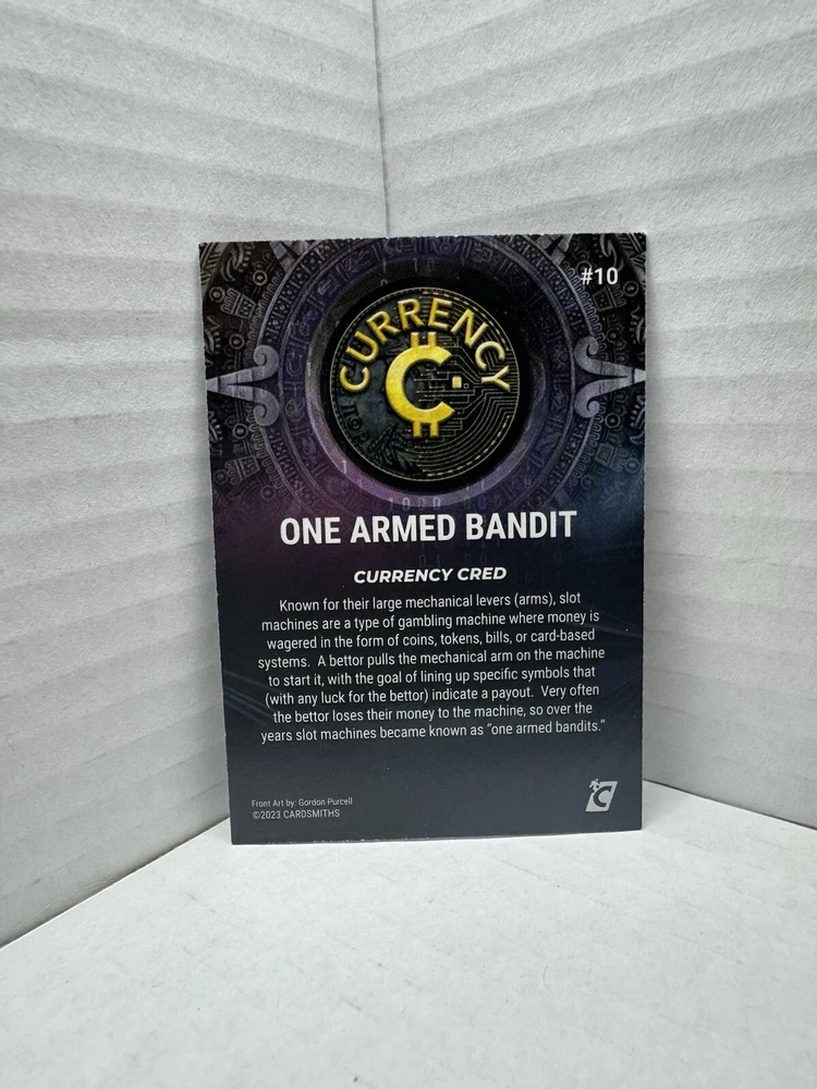 Delve into the world of 2023 Cardsmiths Currency Series 2 with the Base One Armed Bandit #10 trading card. This collectible features the captivating design of Annemarie Nicieza and is a must-have for enthusiasts of the franchise. The card is crafted from premium card stock and boasts a sleek standard size, making it a standout addition to any collection. With its rich detail and exclusive limited edition status, this non-sport trading card is a treasure for both serious collectors and casual fans. It's a genuine piece from the original 2023 series, offering an array of exciting genres including Action, Adventure, and Fantasy. The card comes in English and is suitable for ages 4 and up, ensuring its appeal to a broad audience.