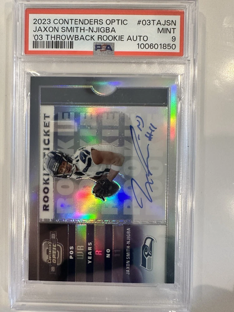 The product is a 2023 Panini Contenders Optic trading card featuring an autograph from Jaxon Smith-Njigba of the Seattle Seahawks. It is a hard-signed rookie card with a Throwback design from the 2003 Rookie Ticket Auto insert set. The card is numbered out of 25 and authenticated by Panini Authentic. It is a rare and valuable collectible for football fans and card enthusiasts.