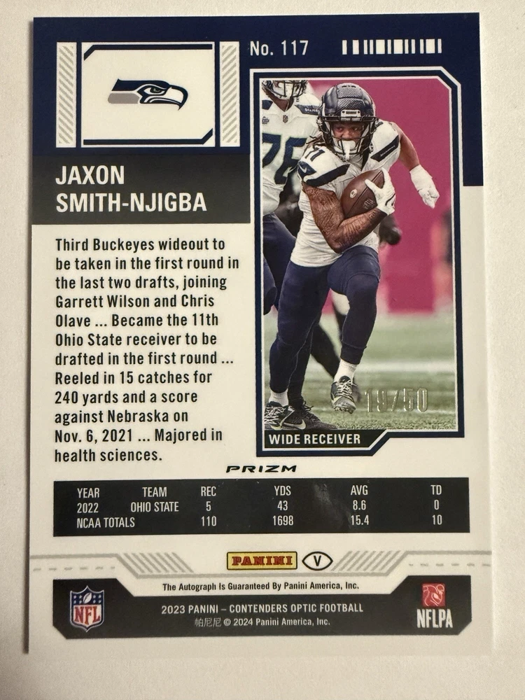 2023 Contenders Optic Jaxon Smith-Njigba #177 Blue Rookie Ticket Auto 9/50. Condition is Ungraded. Shipped with USPS Ground Advantage.