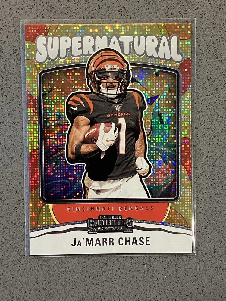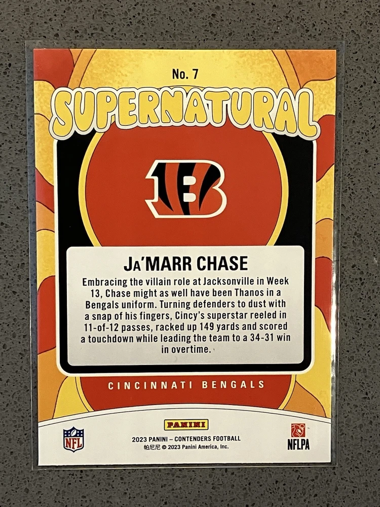 The product is a 2023 Panini Contenders trading card featuring Ja'Marr Chase of the Cincinnati Bengals. It is a Supernatural Sparkles parallel variety card, with card number 7 in near mint or better condition. This insert card is part of the 2023 football season collection and is manufactured by Panini.