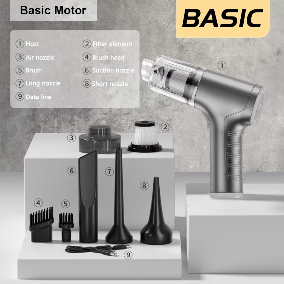The PRO vacuum cleaner is in the state of appearance update, so some customers will receive the PRO vacuum cleaner with a new appearance. However, the internal accessories are the same as the PRO vacuum cleaner with the original appearance, so it will not affect the use. • Rechargeable Battery : No need to constantly replace batteries. Simply recharge the vacuum cleaner and use it again and again. • Wireless Convenience : No more tangled cords or limited mobility. The wireless feature allows for easy and convenient use in any room. • Powerful Suction : The 60w power and strong suction ensure that even the toughest stains are removed with ease. • Dry and Wet Use : This vacuum cleaner is suitable for both dry and wet use, making it versatile and perfect for any cleaning task. [Product Name]: Handheld Vehicle Vacuum Cleaner [Product functions]:mainly cleaning cars, vacuuming, blowing dust, blowing balloons and so on Version introduction CA0002-1: Single filter screen Without vacuum cleaner Only suitable for this vacuum 【Pro Version】 AU00020 [Product material]: ABS [Motor]: New upgrated Brushless motor [Vacuum degree]: 98000PA [Rated speed]: 35500rpm [Capacity of lithium battery]: 2 * 2000mAh [Charging mode]: Type-C charging line [Noise]: ≤ 52dB [Operating temperature]: - 20 ℃~+50 ℃ [Package list]: vacuum cleaner X1 Accessories X 6 Charging line X1 User manualX1 [weight]:550g �� Basic versions】 AU00021 [Product material]: ABS [Motor]: Ordinary motor [Vacuum degree]: 8000PA [Rated speed]: 15500rpm [Capacity of lithium battery]: 2 * 2000mAh [Charging mode]: Type-C charging line [Noise]: ≤ 52dB [Operating temperature]: - 20 ℃~+50 ℃ [Package list]: vacuum cleaner X1 Accessories X 6 Charging line X1 User manualX1 [weight]:550g Notice: 1.The recommended charging time in winter is 8 hours,Charging time in summer is 4 hours 2.During the charging process, the vacuum cleaner cannot be started. You need to unplug the power and start it again. 3..Press and hold for 10 seconds to enter the first gear of the vacuum cleaner 4.Press and hold for two seconds to change the suction power of the vacuum cleaner