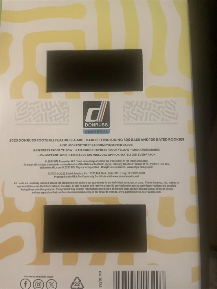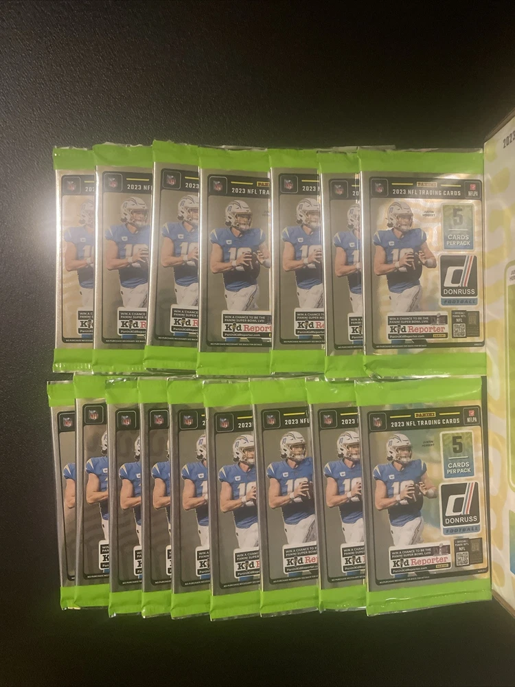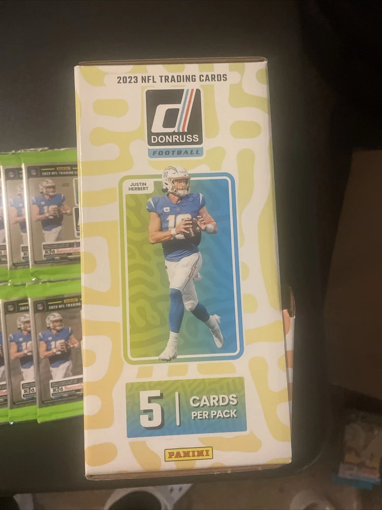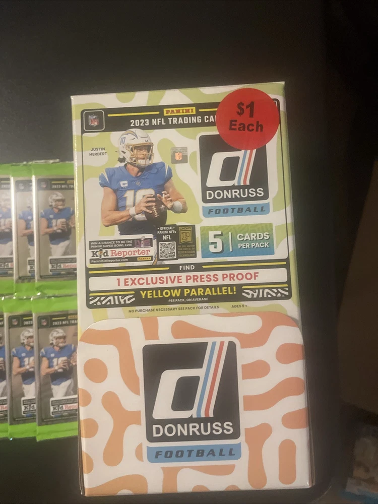 This is a 2023 Donruss Football NFL Gravity Feed Box containing 16 sealed packs with Yellow Parallels. The set features Rookie cards and includes a total of 80 cards. Manufactured by Donruss for the 2023 season, this sports trading card box is tailored for football enthusiasts and collectors.
