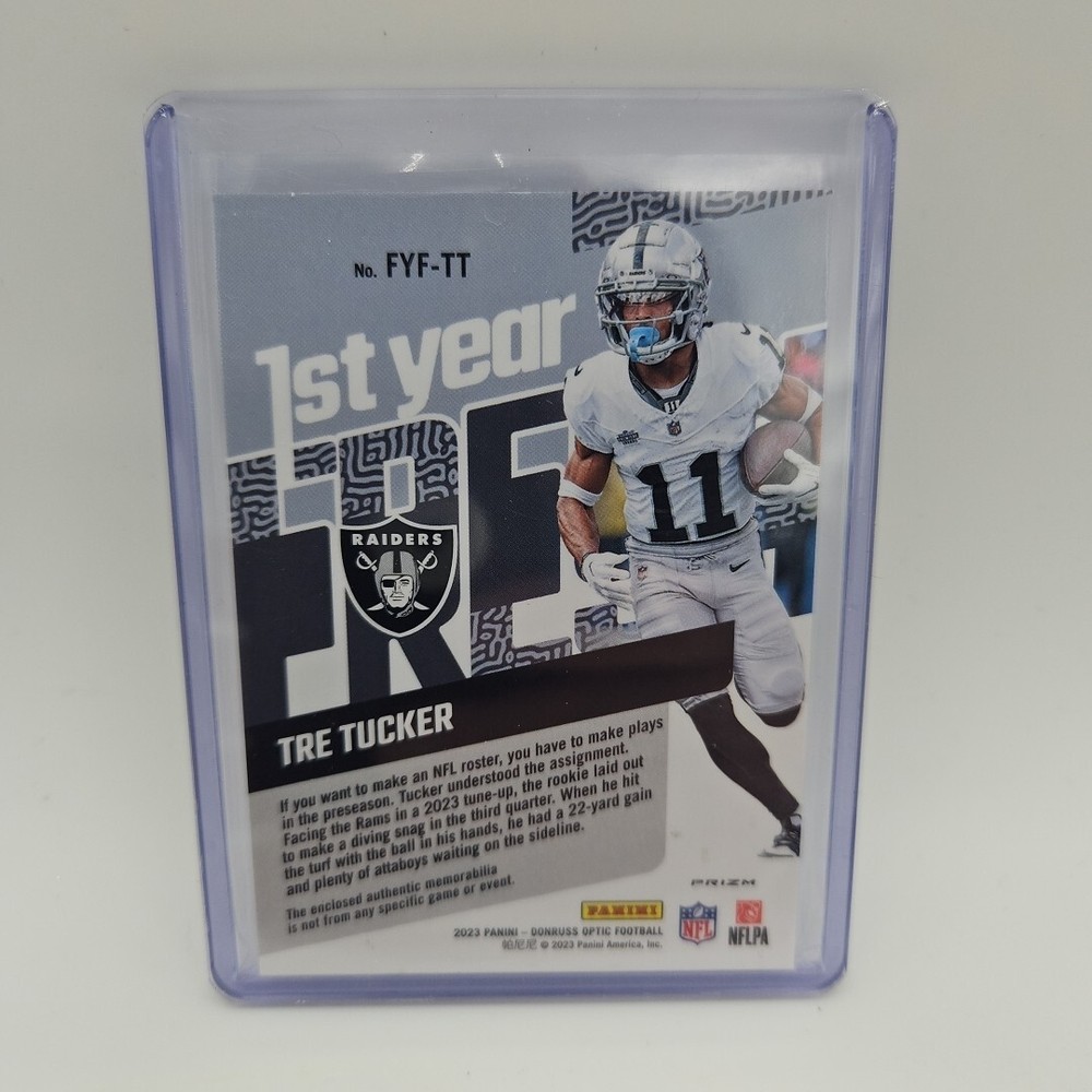 The 2023 Donruss Optic #FYF-TT Tre Tucker 1st Year Fresh Rookie Patch trading card features Tre Tucker, a rookie player for the Las Vegas Raiders in the 2023 season. This sports trading card is part of the Optic parallel/variety set by Donruss, known for its vibrant and unique designs. The card includes a patch element, adding a special touch to this collectible item for fans and collectors of football trading cards.