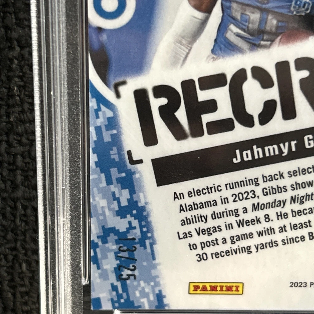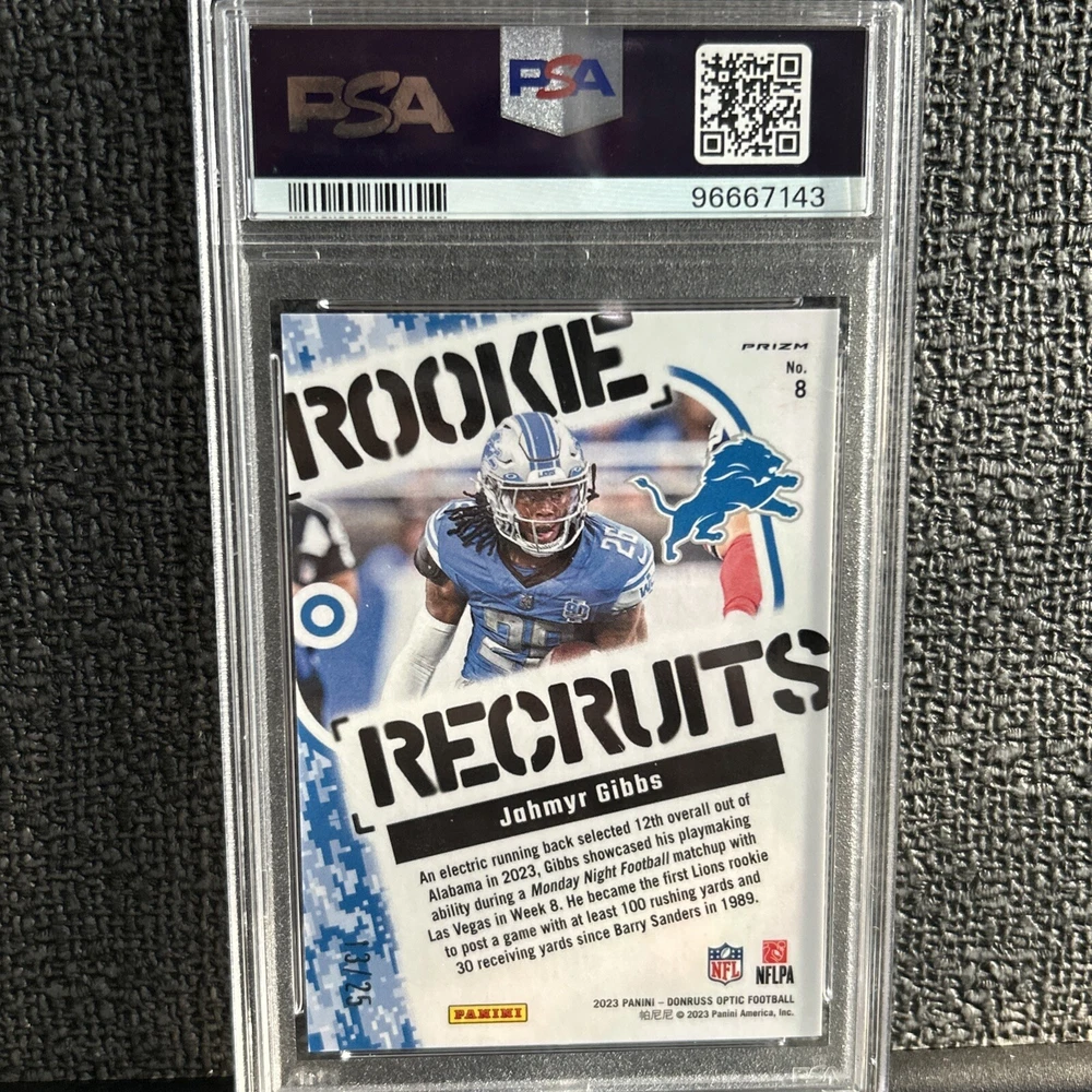Signed By:Jahmyr GibbsAutographed:NoTeam:Detroit LionsPlayer/Athlete:Jahmyr GibbsSeason:2023Features:RookieManufacturer:PaniniCard Number:8League:National Football League (NFL)Parallel/Variety:Purple StarsSport:FootballSet:Donruss OpticType:Sports Trading CardAutograph Format:Label or StickerAutograph Authentication:Panini Authentic
