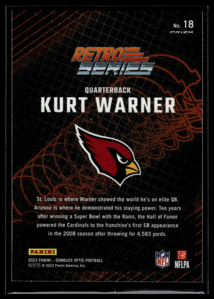 This is a nice example of a 2023 Donruss Optic #18 Kurt Warner Retro Series Other important information about this card: Chase,Checklist,Parallel,Insert,SP,Holo In 2023 Kurt Warner played for the Arizona Cardinals. Please check out our other listings for more great cards.