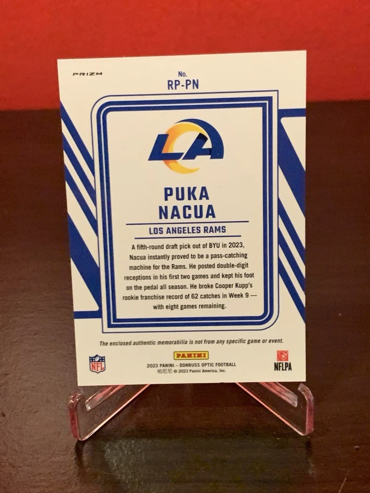 This 2023 Donruss Optic Puka Nacua Blue Hyper Prizm Rookie Phenom Jersey #RP-PN is a must-have for any football trading card collector. With its stunning design and high-quality materials, this card is sure to be a standout in your collection. The card features Puka Nacua, a rising star in the football world, and is perfect for fans and collectors alike. Whether you're a seasoned collector or just starting out, this card is a great addition to your collection. It's perfect for anyone who loves football and wants to add a unique and high-quality card to their collection. So why wait? Add this 2023 Donruss Optic Puka Nacua Blue Hyper Prizm Rookie Phenom Jersey #RP-PN to your collection today!