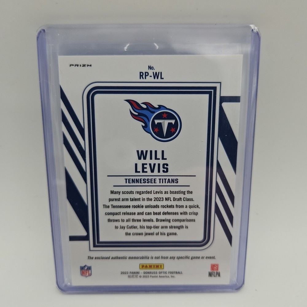The product is a 2023 Donruss Optic trading card featuring Tennessee Titans rookie Will Levis. This specific card is a Rookie Phenom Prizm Patch variation, denoted by the "RP-WL" card number, indicating it includes a patch element. The card is part of the Donruss Optic set and is designed for sports trading card collectors interested in football cards, specifically those focusing on rookies like Will Levis.