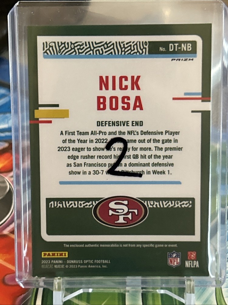 The 2023 Donruss Optic Threads Blue Hyper #13 Nick Bosa Jersey trading card features a memorabilia piece from San Francisco 49ers player Nick Bosa. This modern football card, part of the 2023 Donruss Optic set, is an original single card in near mint/mint condition. A must-have for collectors, this authentic Panini Group card showcases Bosa in his 49ers jersey, making it a valuable addition to any sports trading card collection. **I will combine shipping for $.25 per item. Please just request before paying.**