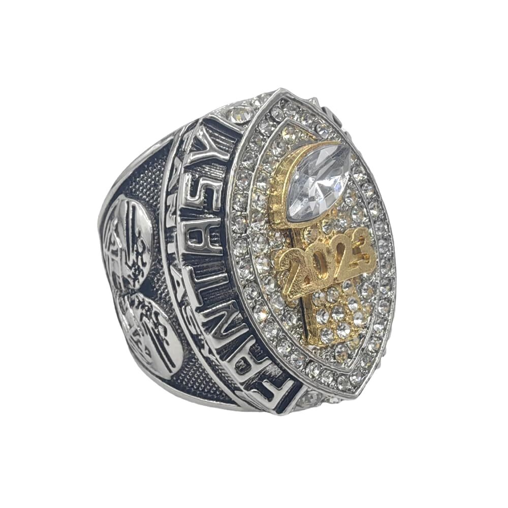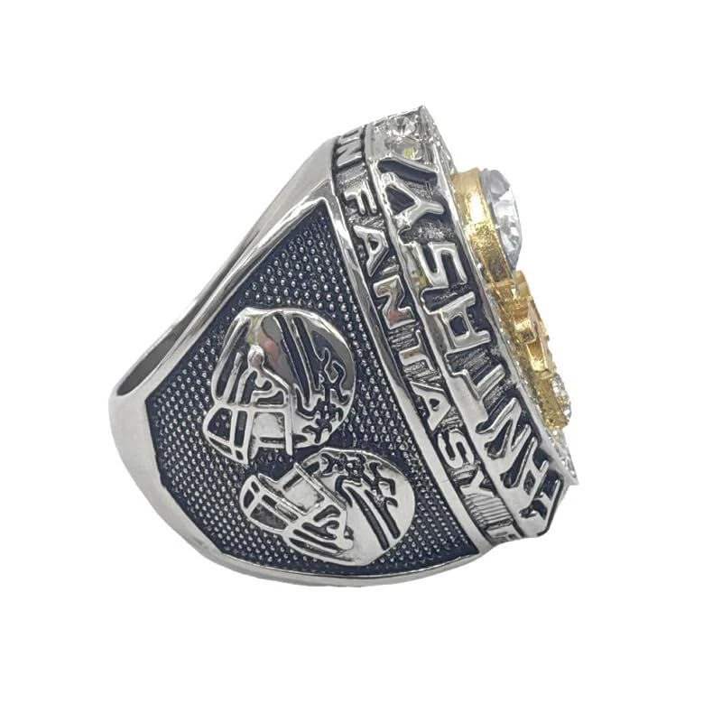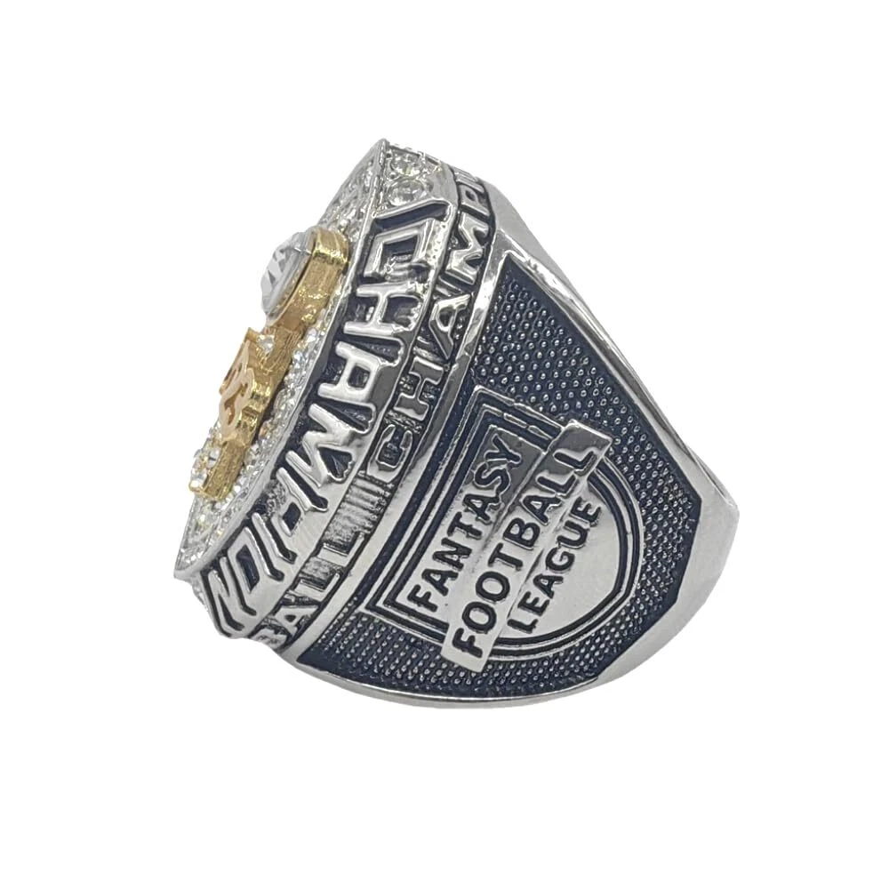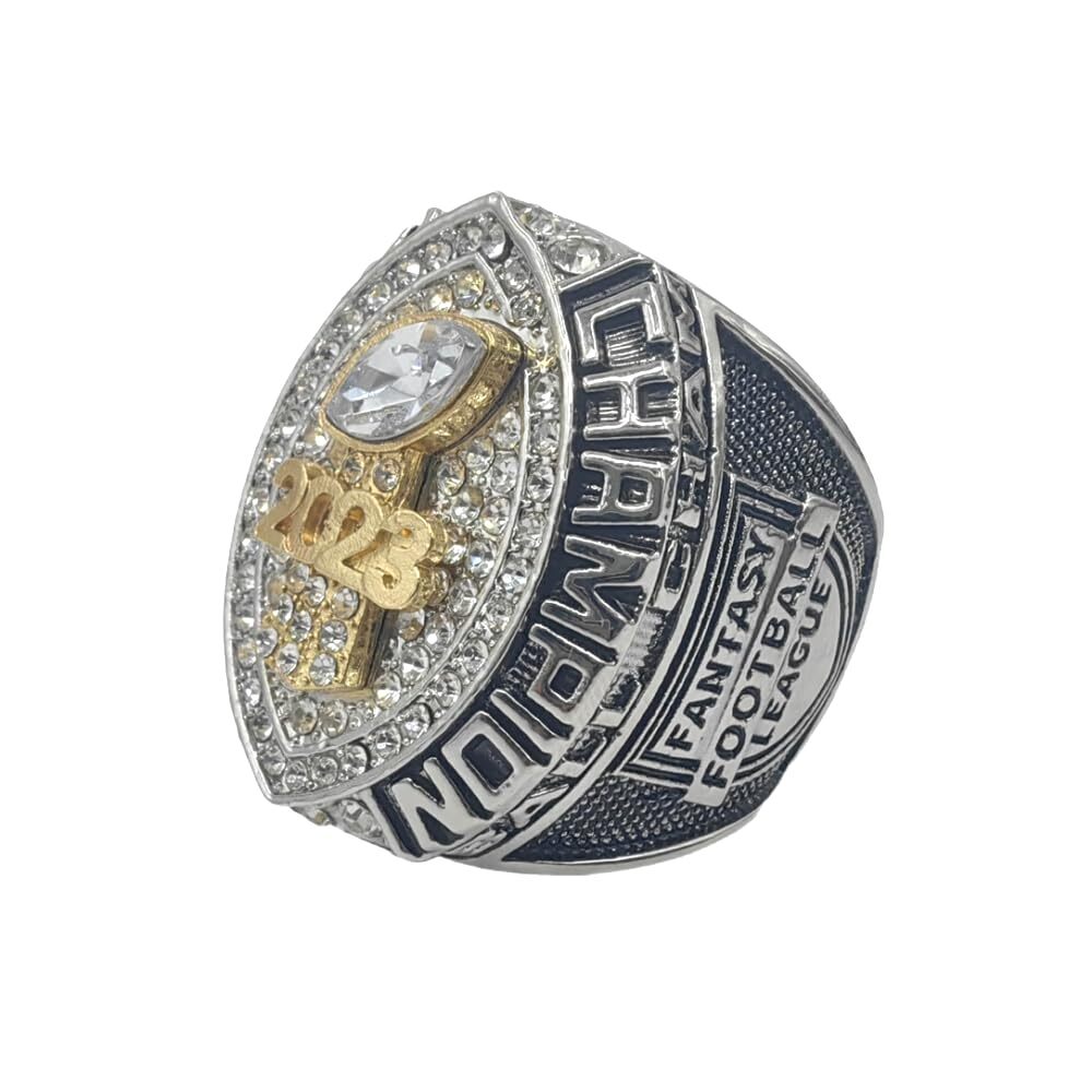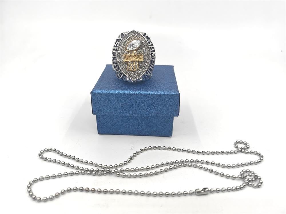 2023 Fantasy Football Championship Rings Trophy Prize With Necklace High quality Environmental Alloy with Plating and Crystal Stones,All made by Hand. The Rings are Size 9 With a 70cm Necklace and Paper Display Case. The ring Weighs 80 grams,gold and silver color championship ring with lots of bling. The Perfect Trophies collections for your league,Gifts for man women games fans.