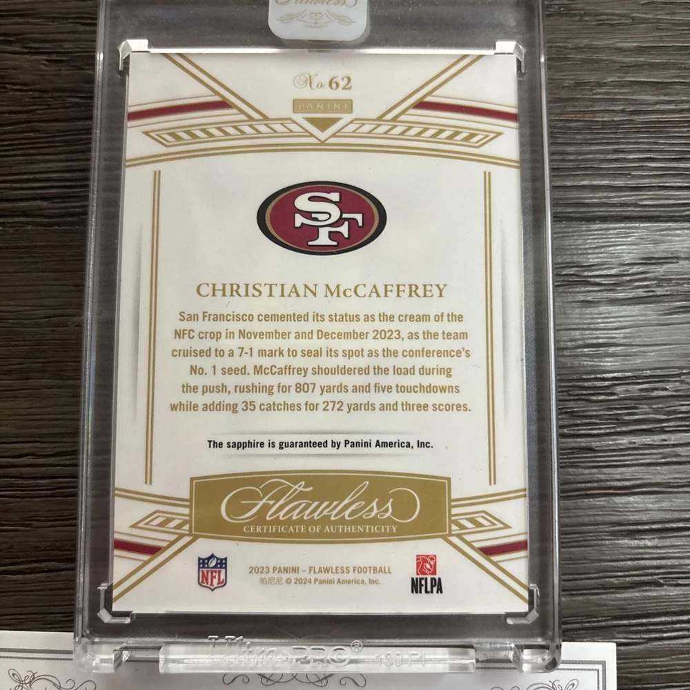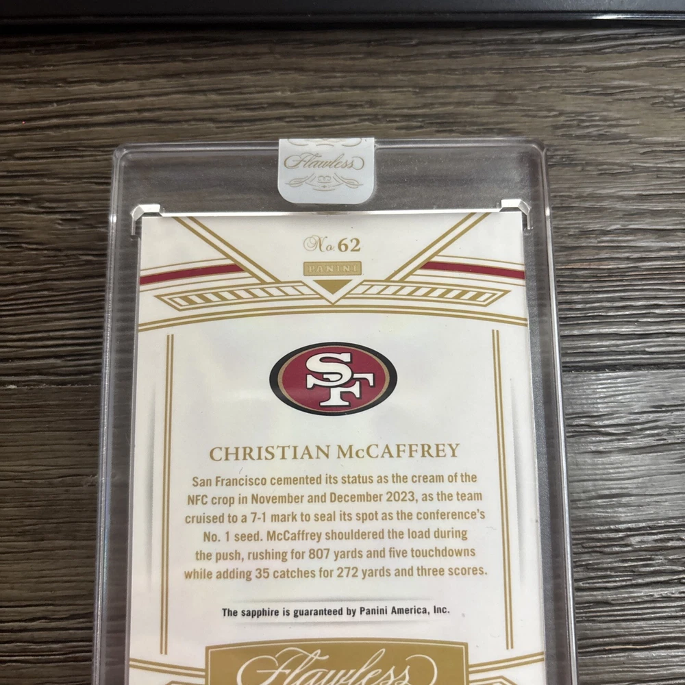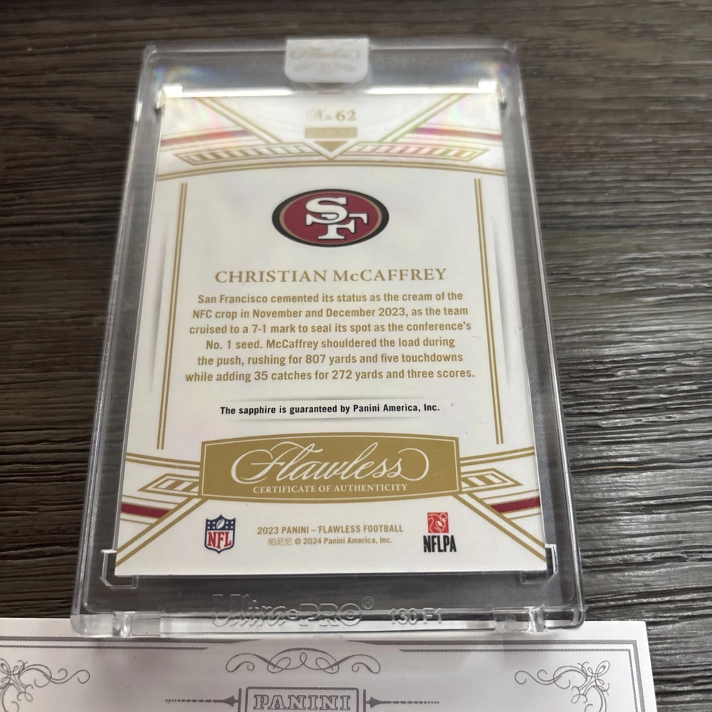 Elevate your sports memorabilia collection with the 2023 Panini Flawless Christian McCaffrey Sapphire Gem card, numbered 62. This exquisite piece features the dynamic San Francisco 49ers running back and is a must-have for football enthusiasts and collectors alike. With a limited print run of just 15, this card is not only a rare find but also a testament to McCaffrey's prowess on the field during the 2023 NFL season. Crafted with precision, this sports trading card boasts an array of features including an insert, serial number, and the sought-after Sapphire parallel variety, ensuring its uniqueness and value. The card comes encased in a protective display-ready packaging, making it an ideal showpiece for your collection or as a treasured gift for the dedicated fan.