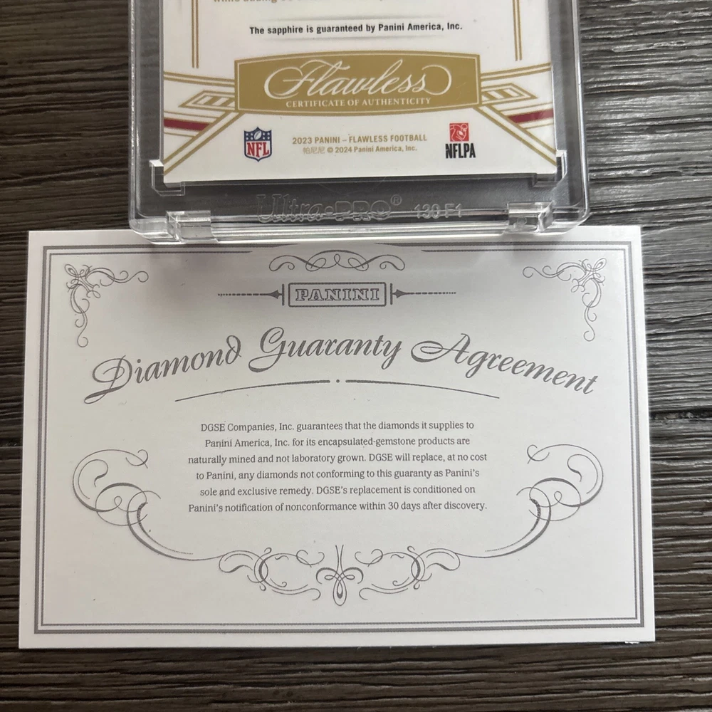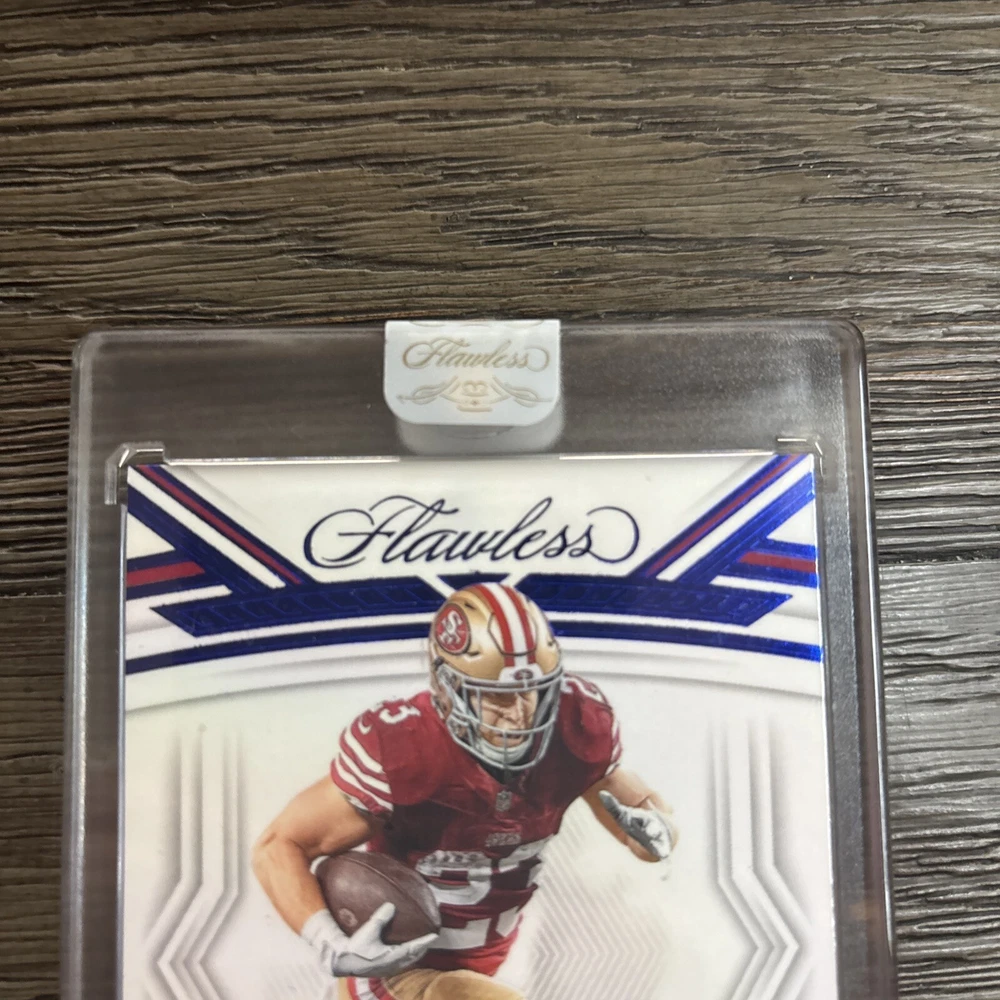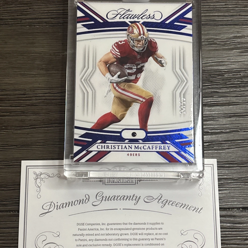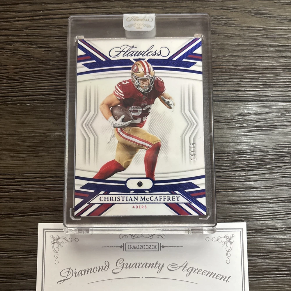 Elevate your sports memorabilia collection with the 2023 Panini Flawless Christian McCaffrey Sapphire Gem card, numbered 62. This exquisite piece features the dynamic San Francisco 49ers running back and is a must-have for football enthusiasts and collectors alike. With a limited print run of just 15, this card is not only a rare find but also a testament to McCaffrey's prowess on the field during the 2023 NFL season. Crafted with precision, this sports trading card boasts an array of features including an insert, serial number, and the sought-after Sapphire parallel variety, ensuring its uniqueness and value. The card comes encased in a protective display-ready packaging, making it an ideal showpiece for your collection or as a treasured gift for the dedicated fan.