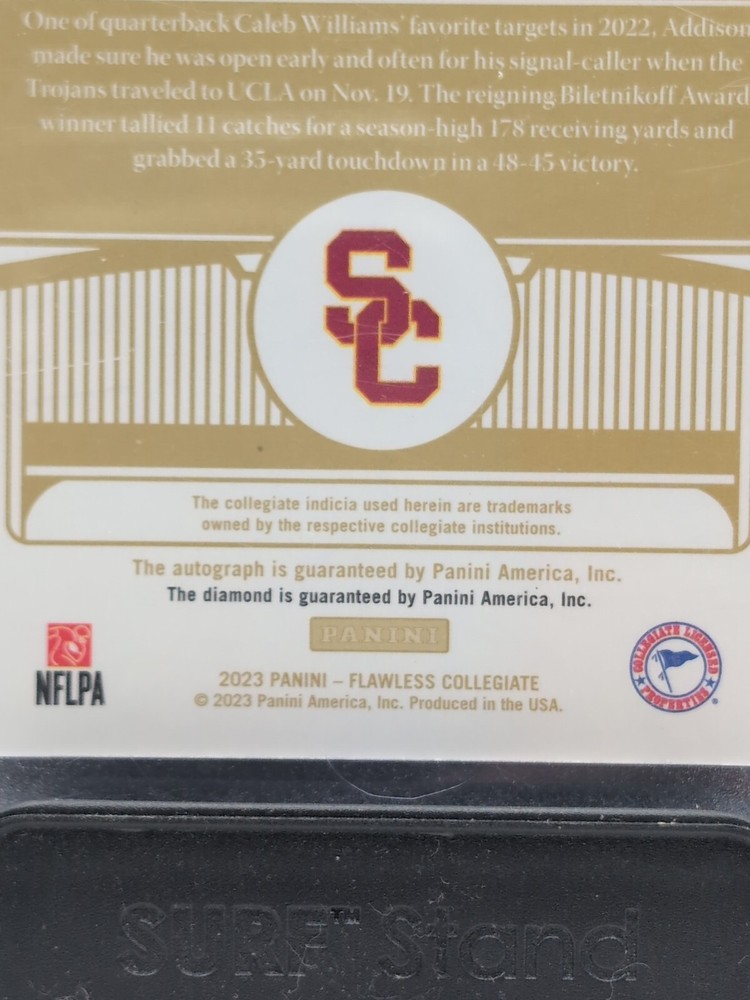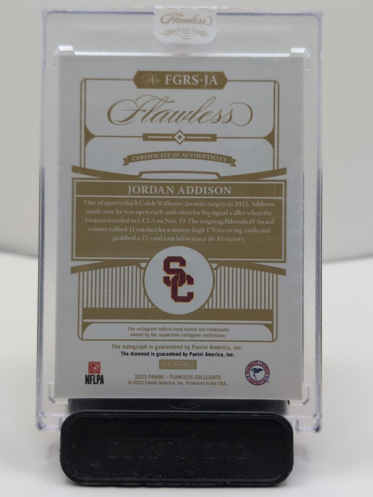 2023 Flawless Collegiate Gems Real Diamond Gold /10 Jordan Addison Auto RC. Condition is Ungraded. Shipped with USPS Ground Advantage.