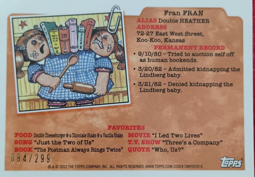 The 2023 Garbage Pail Kids Lazy Louie Green Wave Refractor #084/299 trading card is a highly sought-after collectible featuring the iconic Garbage Pail Kids franchise. As a limited edition refractor parallel, this card boasts a unique design and vibrant green wave effect that sets it apart from the regular base cards. With only 299 copies in existence, this card is a rare find for collectors looking to elevate their trading card singles collection with a distinctive and exclusive addition.