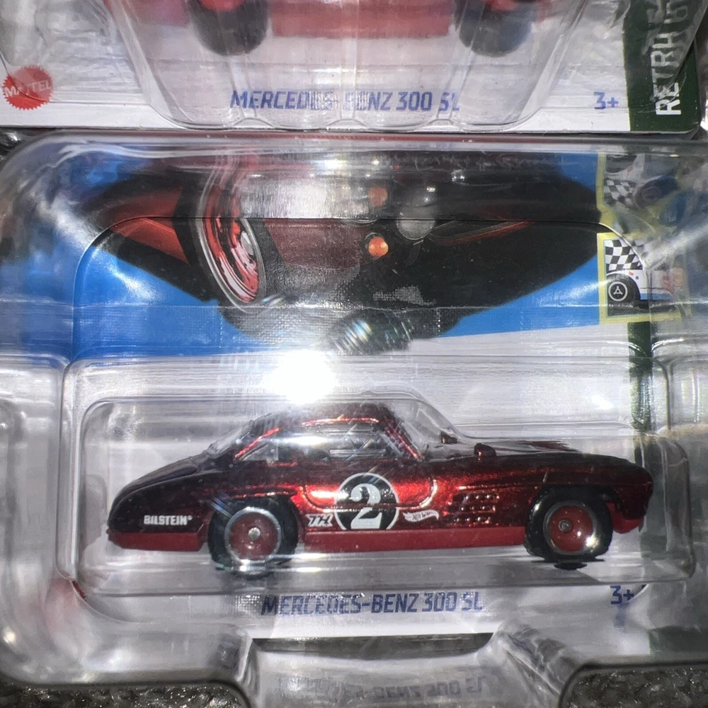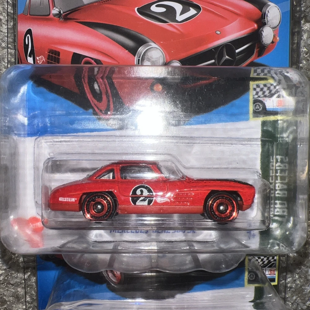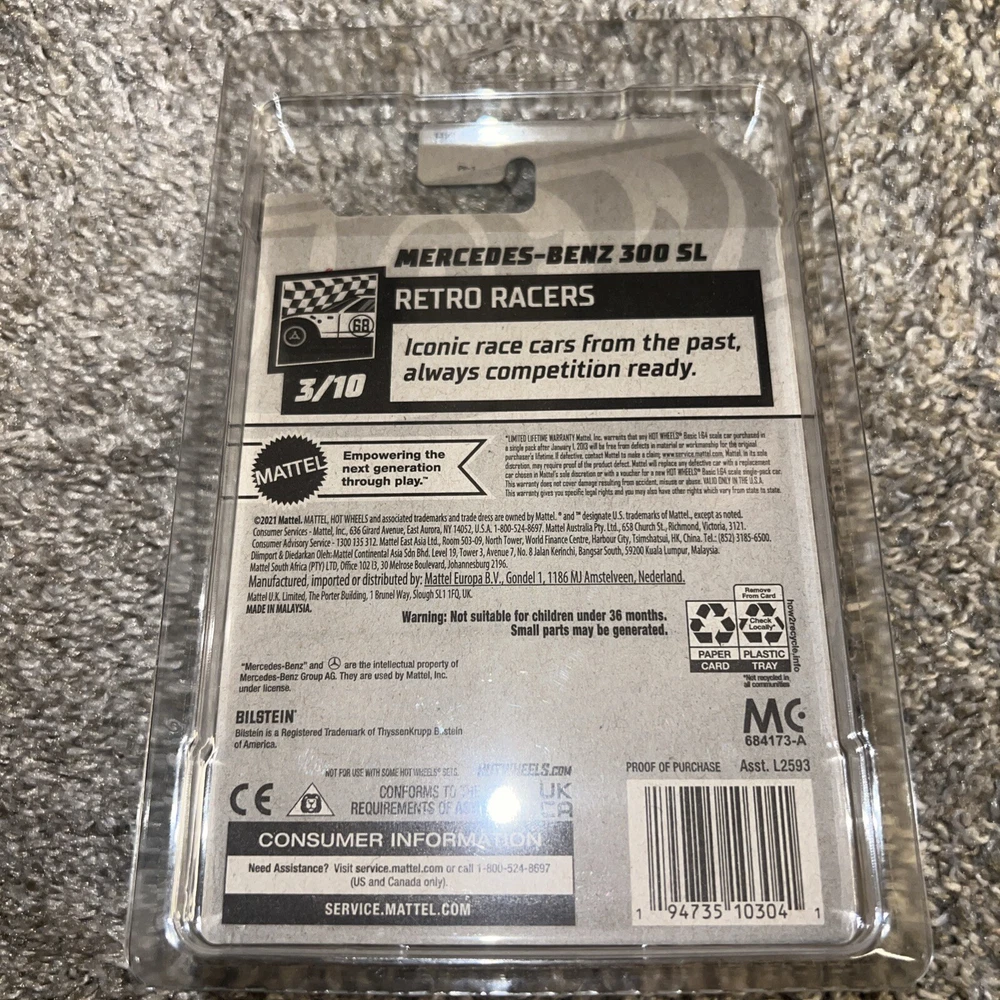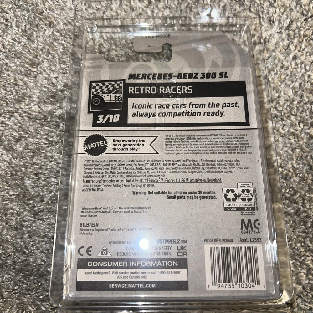 The product is a 2023 Hot Wheels Super Treasure Hunt Mercedes Benz 300 SL diecast car from the Hot Wheels series. This multicolored car is a 1:64 scale model of the 1957 Mercedes Benz 300 SL. Manufactured in Malaysia in 2021, it is part of the Cars character family collection. The car comes with a protector to keep it safe and is highly sought after by collectors for its rarity and special features as a Super Treasure Hunt edition.