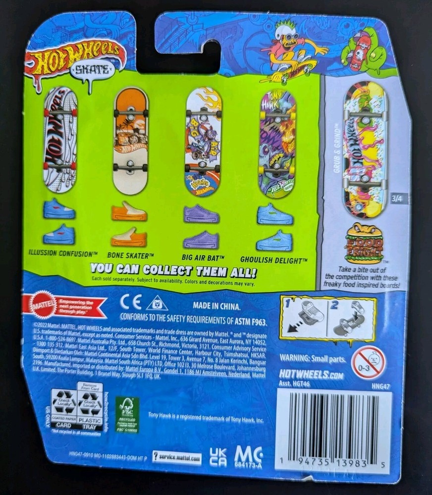 2023 Hot Wheels Skate Tony Hawk Grub And Grind Treasure Hunt Fingerboard NEW You will receive the exact item shown in the photos above. Condition is NEW and unopened, the card is in good shape but does have minor imperfections. See the provided photos for more condition details. Get ready to hit the ramps with this limited edition Hot Wheels Skate Grub And Grind Treasure Hunt Fingerboard! This 1:12 scale skateboard comes in it's original, unopened packaging and is a must-have for collectors and fans of Hot Wheels and Skateboarding. The Grub And Grind model is a perfect addition to any Skate collection, with unique design and attention to detail. Will ship with care. Thanks for looking!