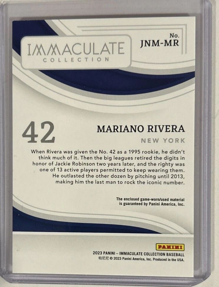This rare and highly sought-after 2023 immaculate Mariano Rivera Game Worn Jersey Relic trading card is a must-have for any true sports fan. With only 42 of these cards in existence, this is a rare find for collectors. The card features a piece of game-worn jersey with Mariano Rivera's name and team, the New York Yankees, prominently displayed. The card is manufactured by Panini and is in excellent shape, making it a valuable addition to any collection. It is a parallel/variety card, which adds to its uniqueness and appeal. This card is perfect for fans of baseball and football, and is sure to be a conversation starter. Don't miss out on the opportunity to own this incredible piece of sports memorabilia.