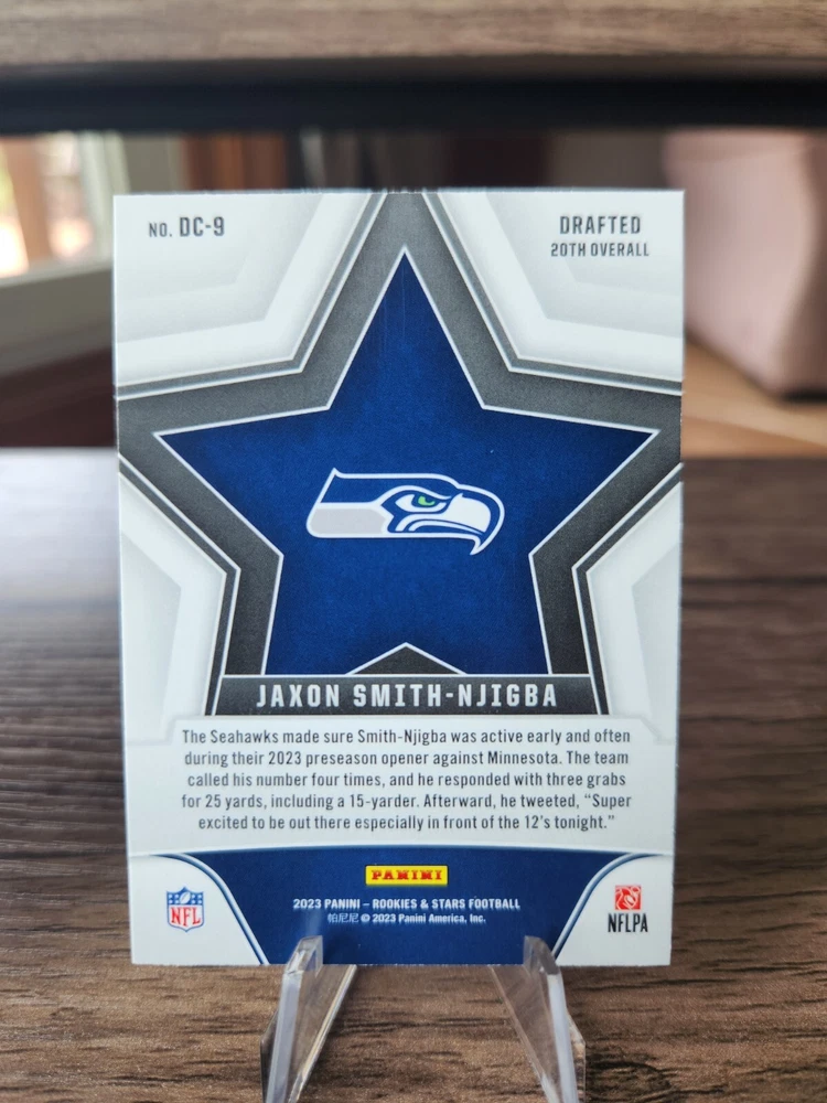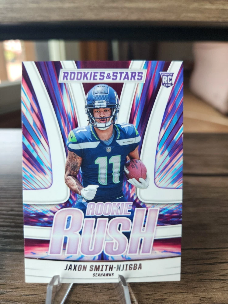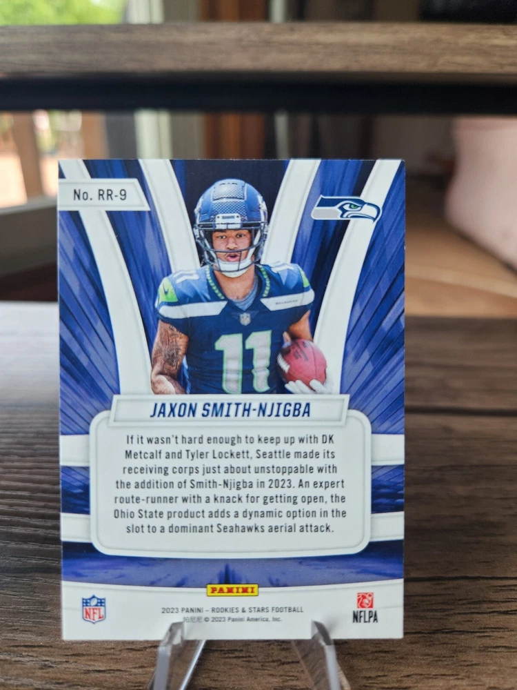 2023 Prizm Jaxon Smith-Njigba Prizmatic Rookie Card #1, 2023 Illusions Jaxon Smith-Njigba Green Holo Rookie Card #91, 2023 Rookies and Stars Jaxon Smith-Njigba Draft Class Rookie Card #DC-9, 2023 Rookies and Stars Jaxon Smith-Njigba Rookie Rush Rookie Card #RR-9. Cards will be shipped in a 6x9 bubble mailer. I do offer combined shipping on multiple orders.