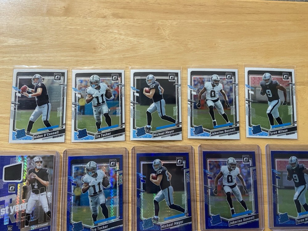 2023 Panini Optic Las Vegas Raiders 10 Rated Rookie Card Lot! Includes 5 Base Rated Rookies, 4 Blue Scope Rated Rookies & 1 Patch Card. Aidan O’Connell Tre Tucker Michael Mayer Tyree Wilson Jakorian Bennett