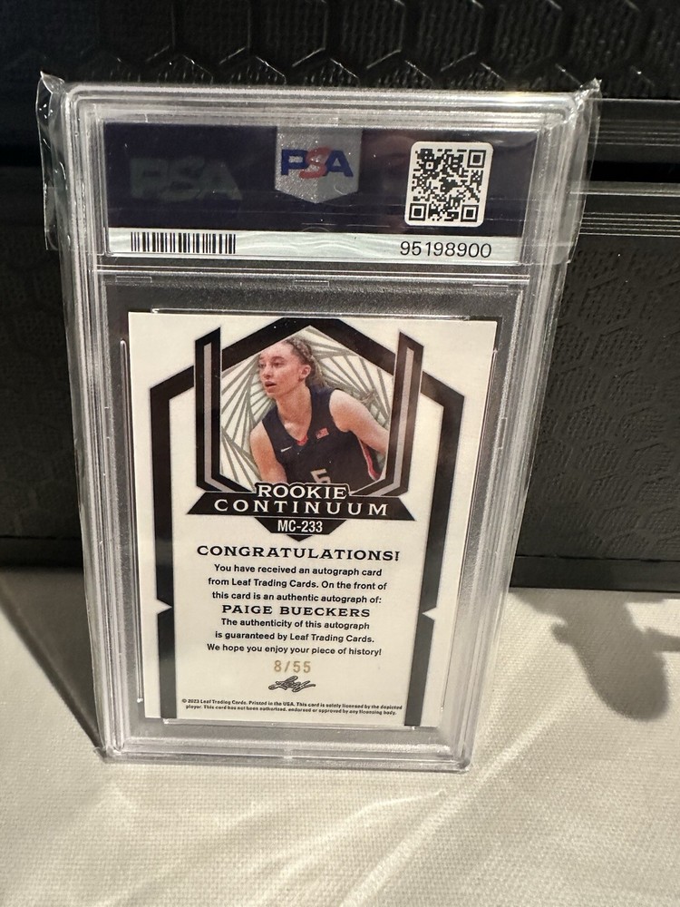 Capture a piece of basketball history with the 2023 Leaf Metal Paige Bueckers Continuum Auto card. This highly coveted sports trading card features the exceptional talent of Paige Bueckers, celebrated rookie of the UConn Huskies, and is a must-have for any basketball enthusiast or card collector. Certified by Professional Sports Authenticator (PSA) with an impressive grade of 9, this card showcases the promise of a rising star in collegiate basketball. The autograph has also been certified by PSA DNA with a perfect score of 10, confirming its authenticity and quality. Secure this unique memorabilia and own a snapshot of athletic excellence.