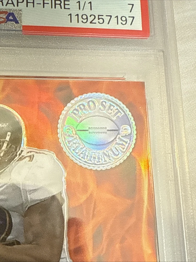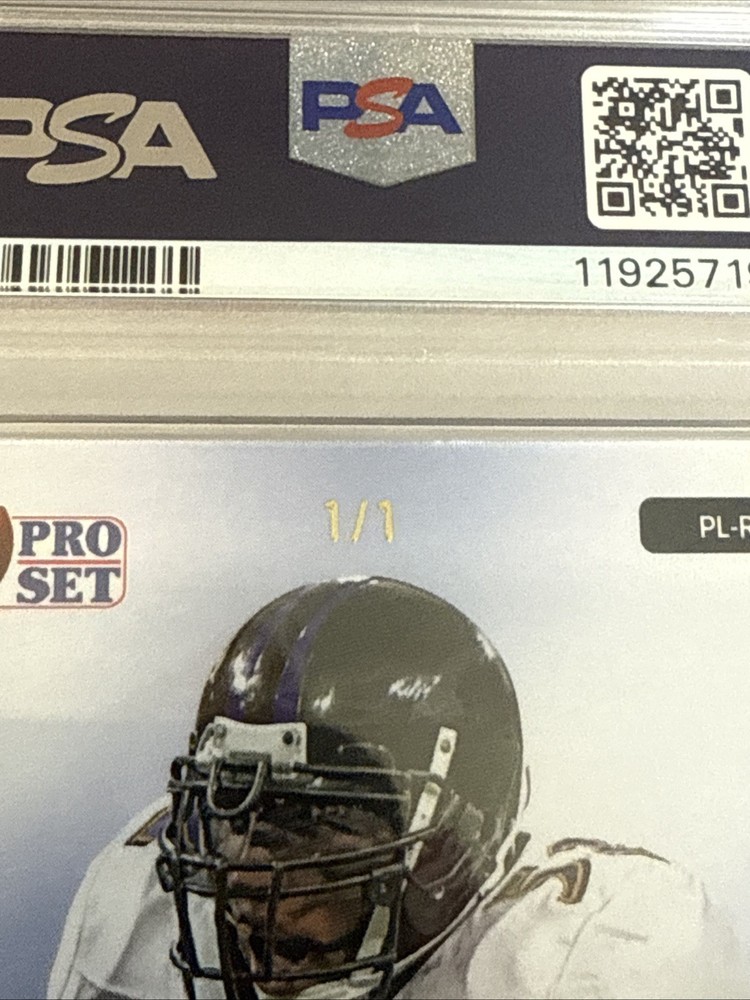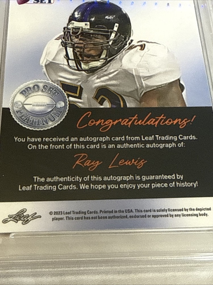 The 2023 Leaf Pro Set Metal Ray Lewis Auto 1/1 trading card is a highly collectible item featuring the legendary NFL player from the Baltimore Ravens. This one-of-a-kind card is autographed by Ray Lewis and has a print run of just 1, making it a rare and sought-after piece for football card collectors. With a grade of 7 from Professional Sports Authenticator (PSA), this original card is a valuable addition to any sports trading card collection, especially for fans of the NFL and the Baltimore Ravens.