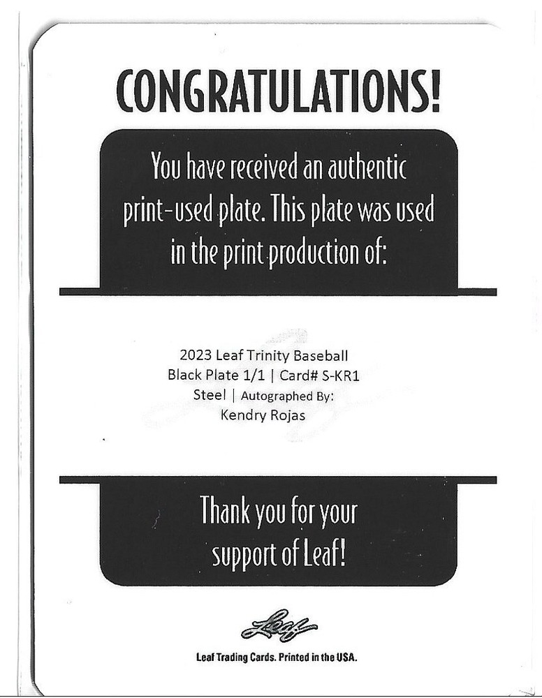 Capture the essence of baseball's future with the 2023 Leaf Trinity Steel Black Plate 1/1 Auto card featuring Kendry Rojas of the Toronto Blue Jays. This exclusive collectible, card number S-KR1, showcases Rojas's autograph authenticated by Leaf, ensuring its authenticity and adding to its rarity. The black plate variety highlights its uniqueness among trading cards, with its sleek design and distinct appearance. Crafted in the United States, this card is a testament to the player's potential and a treasure for fans and collectors alike. Its originality is backed by its 1/1 status, meaning it's the only one in existence, enhancing its value significantly. The card is standard-sized, printed on high-quality paper, and features the Major League Baseball player in his athletic prime, making it a stellar addition to any collection.