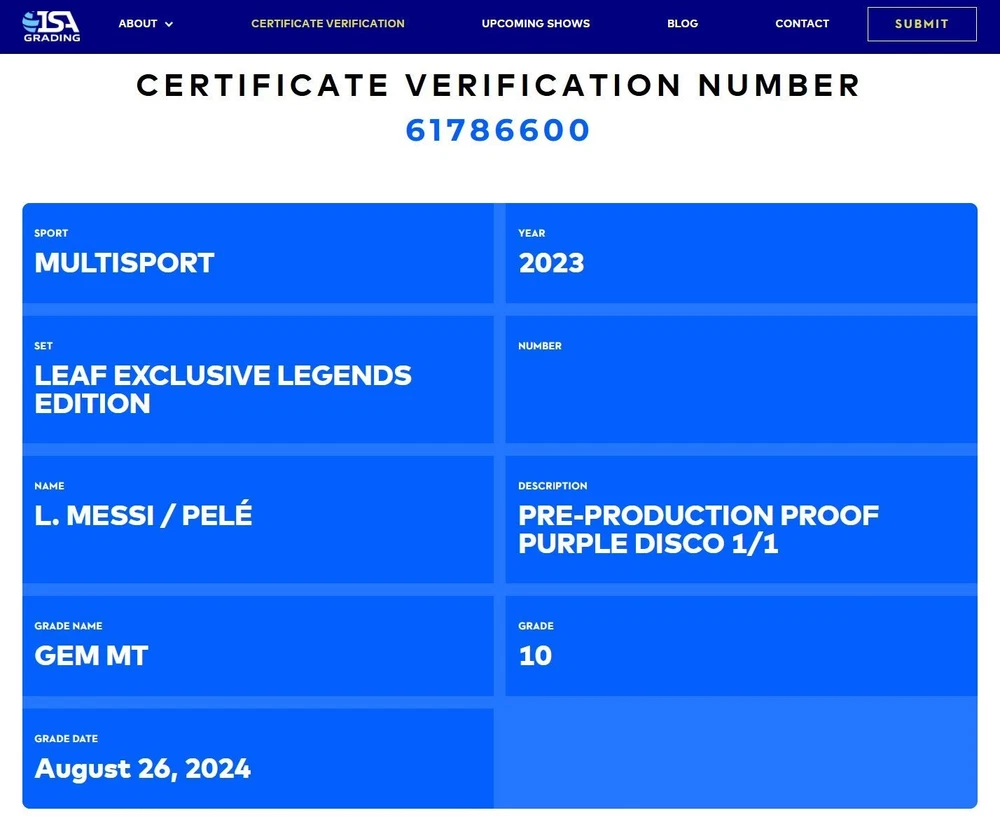 Step into the realm of football royalty with the Pele / Lionel Messi 2023 Leaf Exclusive Legends Edition Disco Purple Pre-Production Proof. This card unites two of the sport's all-time greats in an unprecedented, one-of-a-kind collectible. Key Features: Ultimate Rarity: With the serial number #NNO #1/1, this card is the sole example in existence, making it a collector's holy grail. Dazzling Design: The Disco Purple finish gives this card a breathtaking, exclusive look, highlighting the legendary duo in a way that's both rare and beautiful. Immaculate Condition: Graded ISA 10, this card is in gem mint condition, ensuring that its edges, corners, and surface are in pristine state. Pre-Production Proof: This card is from the pre-production phase, offering a unique glimpse into the creation process of this exclusive set. Dual Legends: Featuring both Pele, the legendary Brazilian striker, and Lionel Messi, the modern-day maestro, this card is a testament to soccer's timeless greatness. Why You'll Love This Card: Historical Significance: Owning a card that features both Pele and Messi is like owning a piece of football history, bridging generations of the sport's excellence. Investment Opportunity: The rarity of this card, combined with the iconic status of the players, makes it a potentially lucrative investment for the future. Display Piece: The unique design and the legendary figures on this card make it not just a collector's item but a stunning piece for display. Perfect For: Collectors of soccer memorabilia who seek out the rarest and most unique items. Fans of both Pele and Messi, looking to celebrate the legacy of these icons in one extraordinary piece. Those who appreciate the art of trading cards, where condition, rarity, and subject matter converge to create value. Secure Your Piece of Football Royalty: Don't miss the chance to own this unparalleled collectible. The Pele / Lionel Messi 2023 Leaf Exclusive Legends Edition Disco Purple Pre-Production Proof is more than just a card; it's a celebration of football's past and present. Add it to your collection today! Please note: Due to its unique nature, this item will be shipped in protective casing to ensure its condition. Once sold, this item cannot be replicated or replaced. Disclaimer: All cards are sold as-is, and their condition is described to the best of our ability. However, grading can be subjective, and we encourage buyers to review images or inquire for further details.