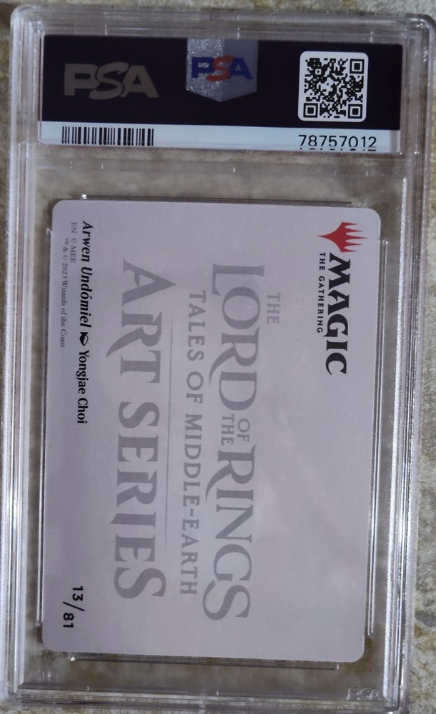 This is a 2023 Magic The Gathering Lord Of The Rings trading card featuring Arwen, portrayed by Liv Tyler. It is a non-sport art card from a set that combines Magic: The Gathering and The Lord of the Rings franchises. The card is numbered 13 and manufactured by Wizards of the Coast. It is a PSA Gem Mint 10 graded collectible.