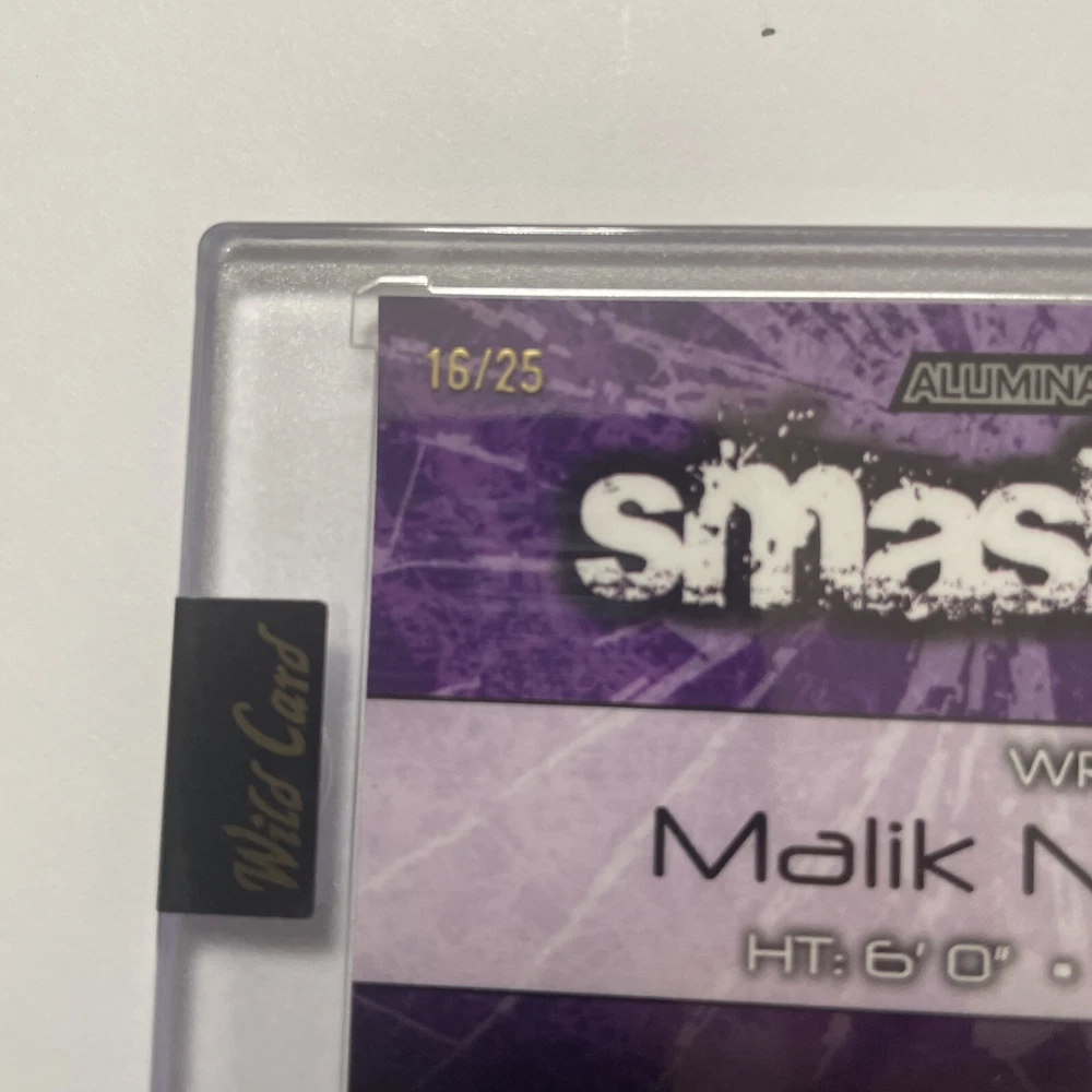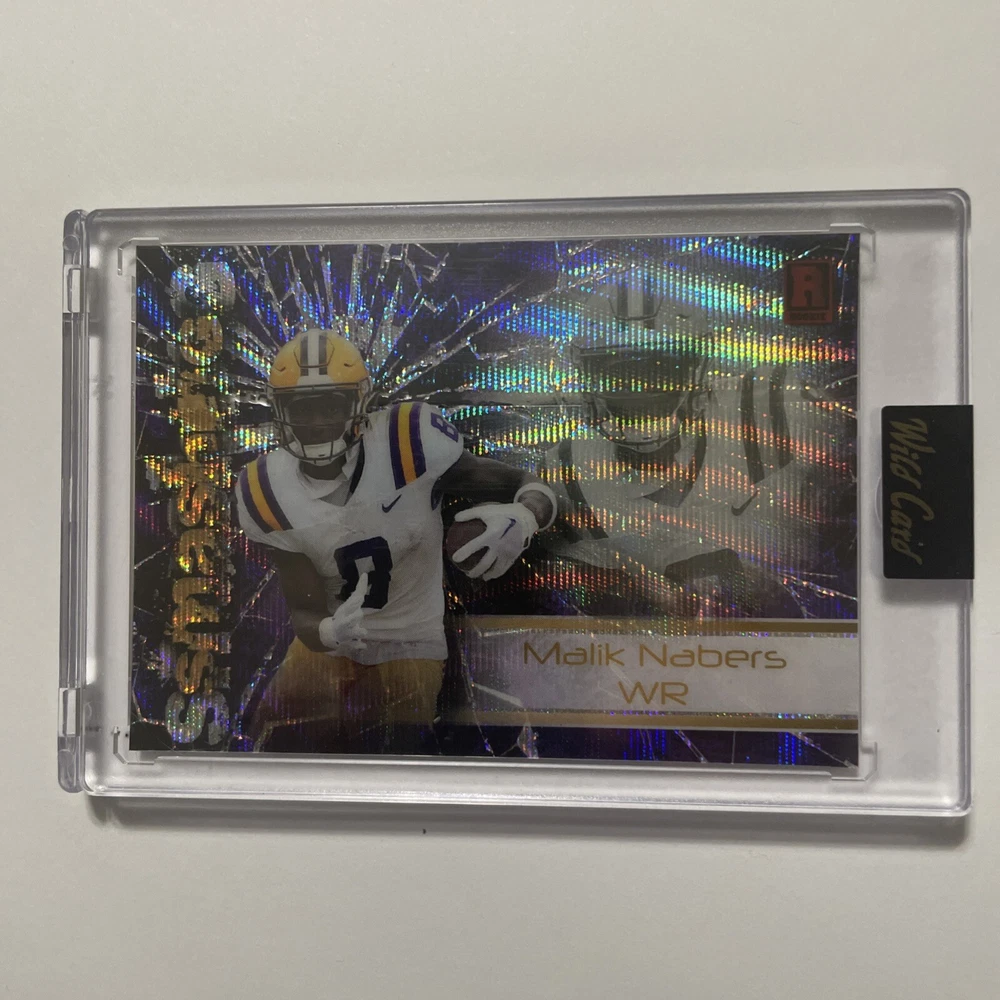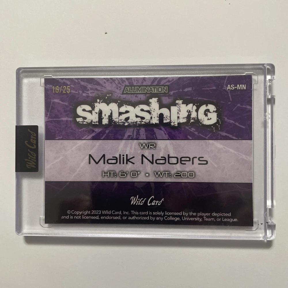 Elevate your sports memorabilia collection with the 2023 Malik Nabers Wild Card Smashing Color Match card, numbered 16 out of 25. This card celebrates the dynamic wide receiver and his electrifying presence on the football field. Crafted by the reputable Wild Card manufacturer, this trading card is a must-have for fans and collectors alike. The card features a stunning color match design that captures the essence of Malik Nabers' vibrant career. It belongs to an exclusive set that is highly sought after by enthusiasts of the sport. Whether you're a dedicated follower of Nabers' burgeoning career or a connoisseur of unique sports collectibles, this card is an exceptional piece to own.