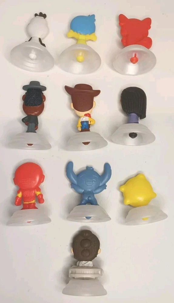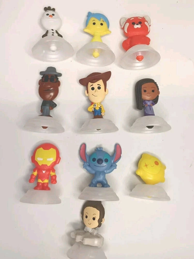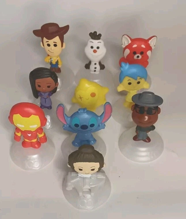 Celebrate the 100th anniversary celebration of Disney with this lot of 10 used loose figures with minimal wear in good condition McDonald's Happy Meal toys from the year 2023 with htf characters in lot. These toys feature beloved Inside and out and more characters and are sure to bring joy to collectors and fans alike. Each toy is in excellent condition and has been carefully collected and stored since its original release. Don't miss your chance to own a piece of Disney and McDonald's history!