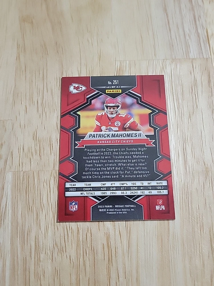 Athlete:Patrick Mahomes IIAutographed:NoProduct:Single-ParallelSeason:2023Type:Sports Trading CardCard Number:251Year:2023Features:Parallel/Variety, Short Print, InsertTeam:Kansas City ChiefsCard Name:mosaic blue reactiveCard Manufacturer:Panini America, Inc.Manufacturer:PaniniSet:2023 panini mosaicPlayer/Athlete:Patrick Mahomes, Patrick Mahomes IISport:FootballOriginal/Reprint:OriginalFranchise:N/ALeague:National Football League (NFL)Player:Patrick Mahomes IIYear Manufactured:2023Parallel/Variety:blue reactive