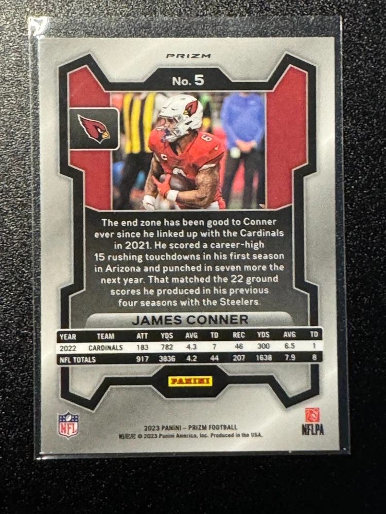 CLEAN This 2023 NFL Prizm trading card features James Conner of the Arizona Cardinals in a Green Wave parallel variety. The card is part of the base set and has the card number #5. It is a sports trading card and was manufactured by Panini for the 2023 season. The card is a must-have for any National Football League (NFL) fan and collector. It is not autographed and is a great addition to any sports memorabilia collection. Get this card now and add it to your Sports Mem, Cards & Fan Shop collection!