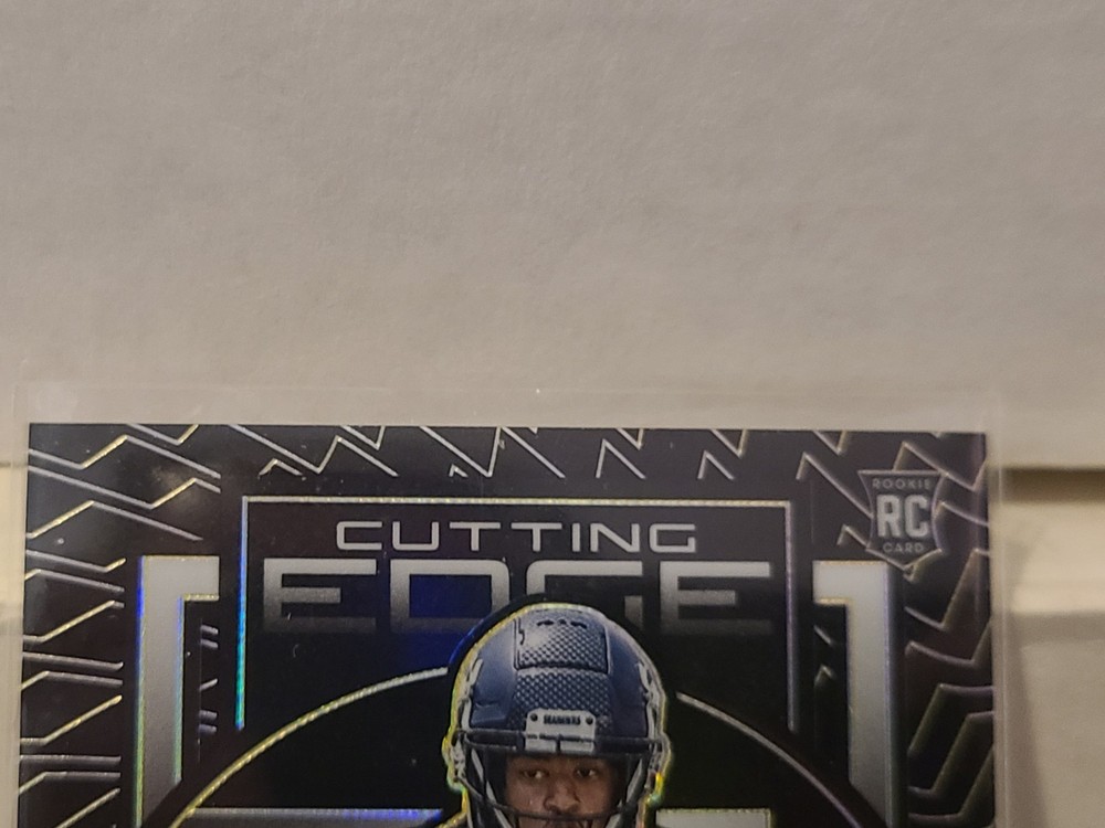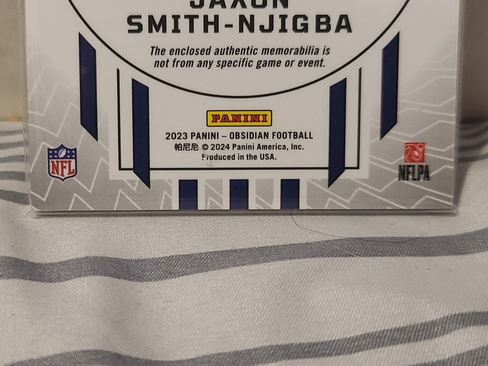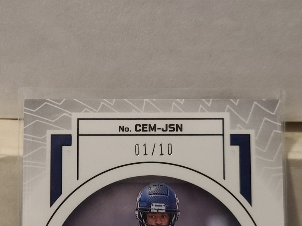 Elevate your collection with the 2023 Obsidian Football Cutting Edge Memorabilia card featuring Jaxon Smith-Njigba. Boasting a sleek Black Prizm parallel, this card is a standout with its serial numbering, indicating a limited edition piece with the card number CEM-JSN, exclusive to only 10 in existence. Crafted by Panini, the respected manufacturer of sports trading cards, this item captures the essence of the Seattle Seahawks' dynamic receiver. The card is not autographed, preserving the pristine design of the Obsidian set, which is known for its sophisticated aesthetic and connection to the game's premier athletes. Own a piece of football history with this remarkable collector's item.