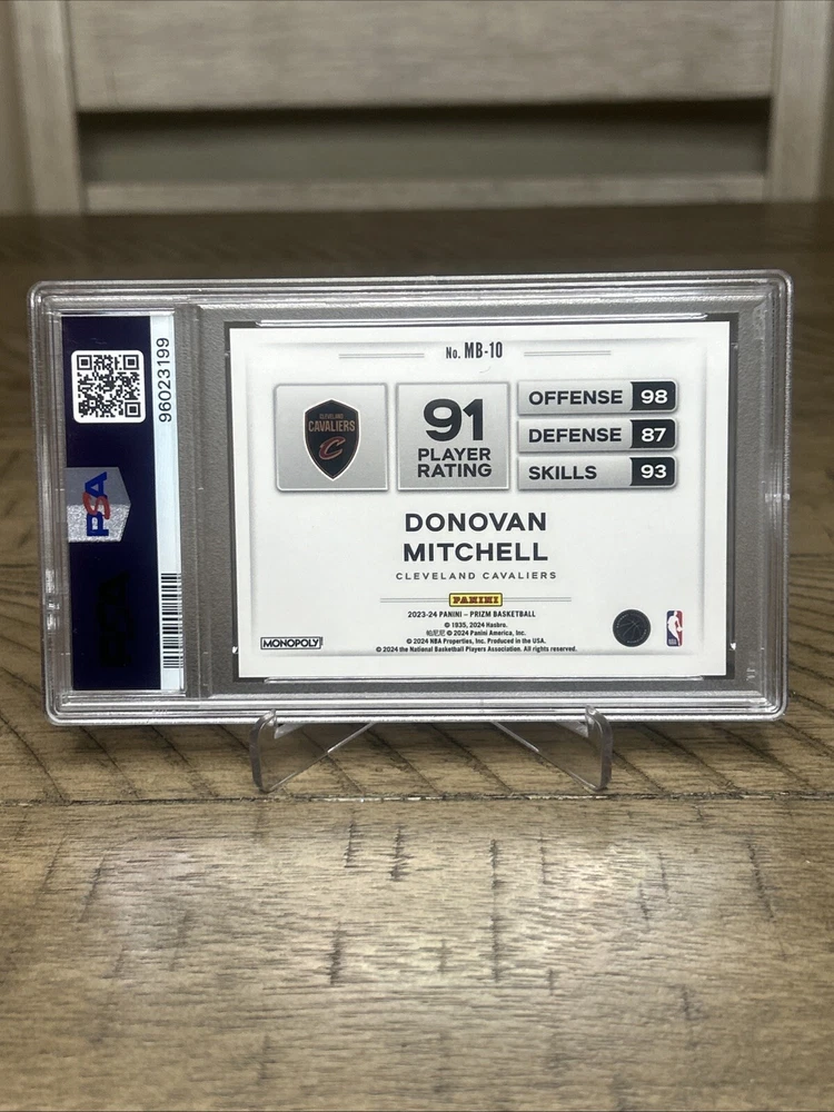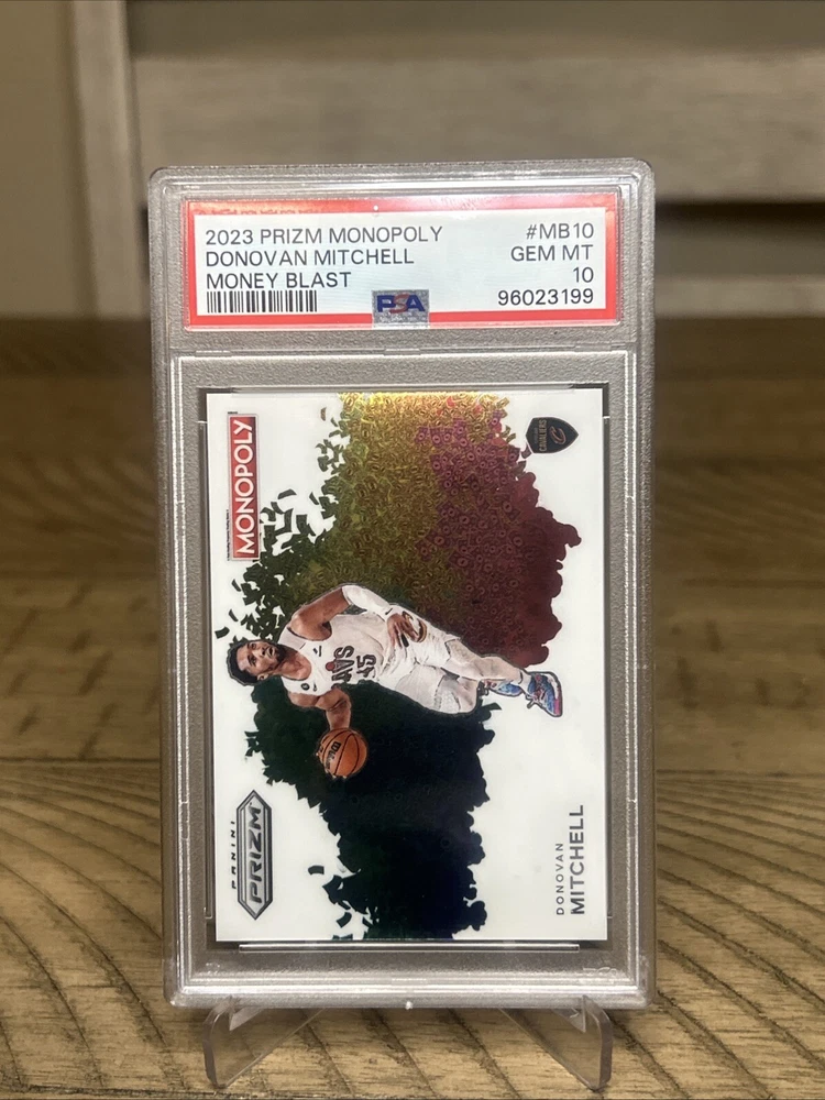 Elevate your basketball card collection with the 2023-24 Panini Prizm Monopoly MB10 Donovan Mitchell Money Blast card. This SSP Ultra Rare card showcases the Cleveland Cavaliers' star in vibrant detail, complete with the prestige of a Prizm parallel. A must-have for fans and collectors alike, the card is a striking representation of Mitchell's dynamic presence on the court during the NBA Finals. Expertly crafted by Panini, the card is standard size, printed on high-quality card stock, and meets the PSA 10 Gem Mint standard, ensuring a flawless addition to your collection. The Money Blast insert set captures the essence of the game's financial stakes, making it a unique piece of sports memorabilia that commemorates both Mitchell's athletic prowess and the excitement of the NBA.