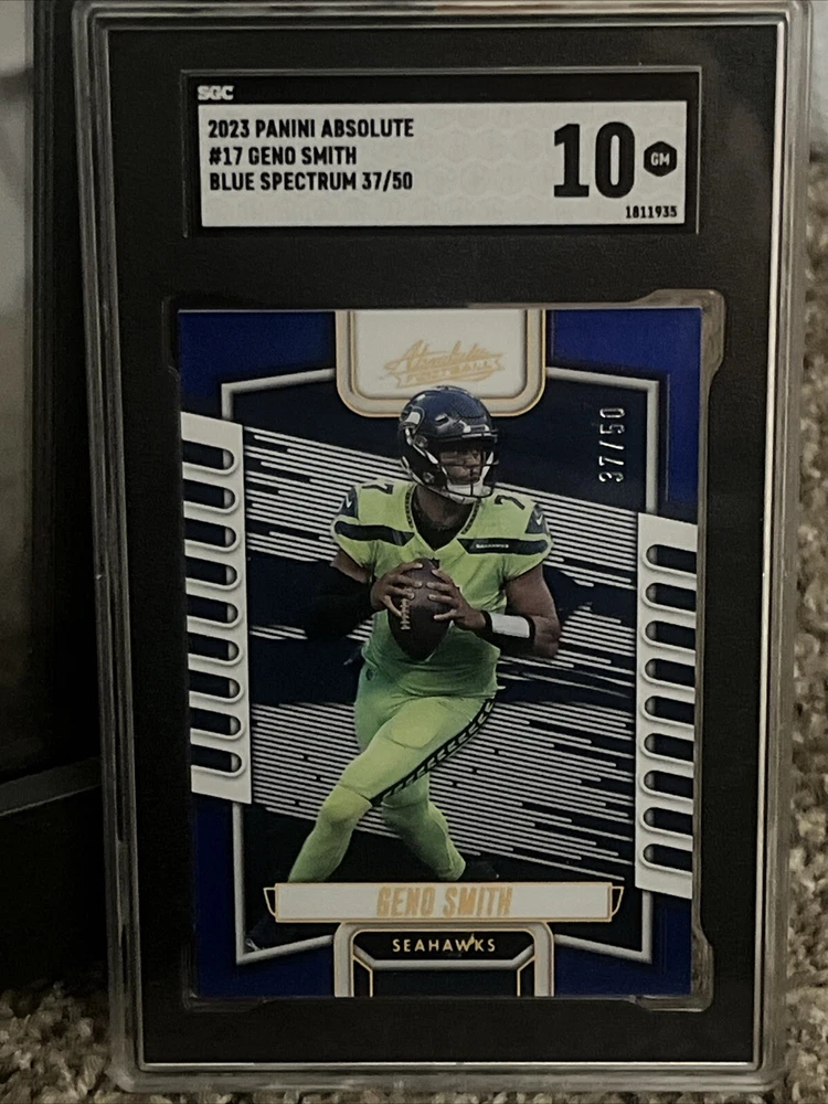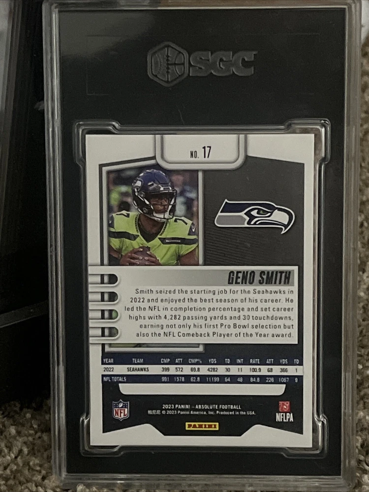 The product is a 2023 Panini Absolute trading card featuring Geno Smith of the Seattle Seahawks. This particular card is a Blue parallel variety with a print run of only 50 copies, making it a rare find for collectors. It is serial numbered as #17 and has received a grade of SGC 10, indicating excellent condition. As it is not autographed, the focus is on the card design and rarity, appealing to fans of football trading cards and collectors of limited edition sports memorabilia.