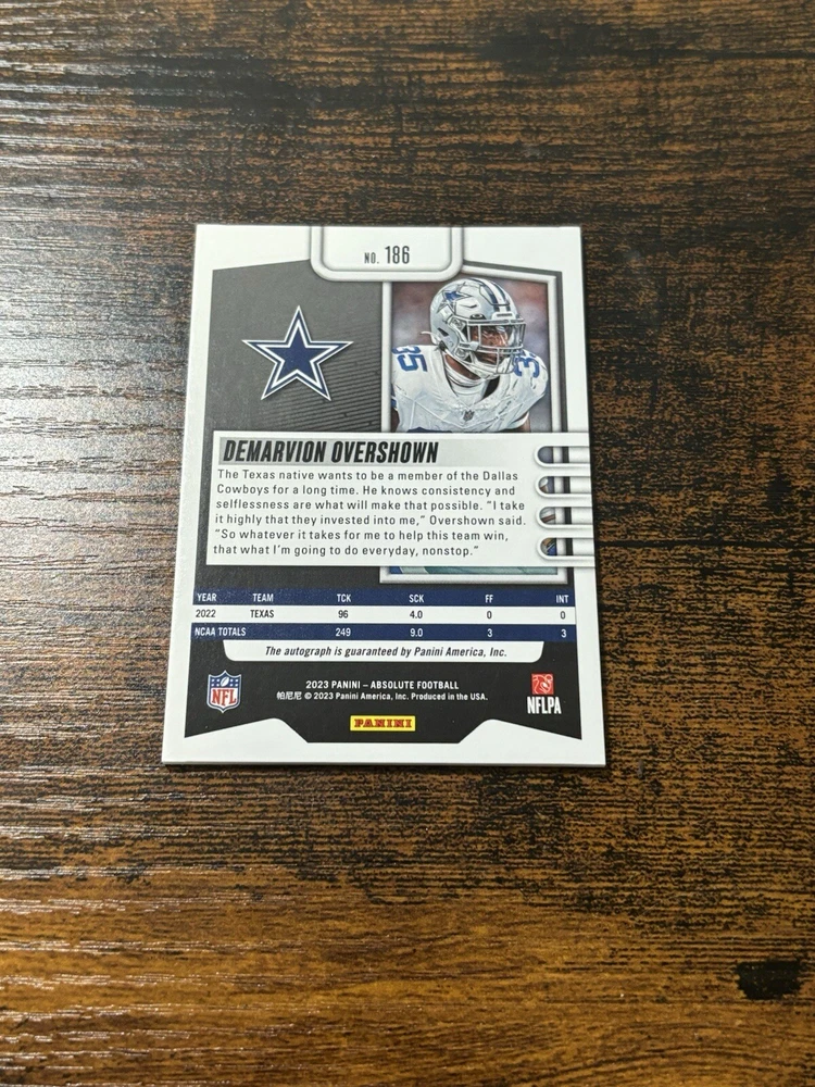 2023 Panini Absolute Rookies Signatures DeMarvion Overshown #186 RC Auto /199 What you see in the pics is what you are receiving. I try my best to provide the clearest pictures possible, but assume when buying that not every card will gem. Please review pics for surface. I will not be reliable for cards that do not gem, assume every card is an 8 or better unless listed otherwise or already graded. If you have questions, feel free to shoot me a message! Thanks for looking and make sure to check out the rest of my store!
