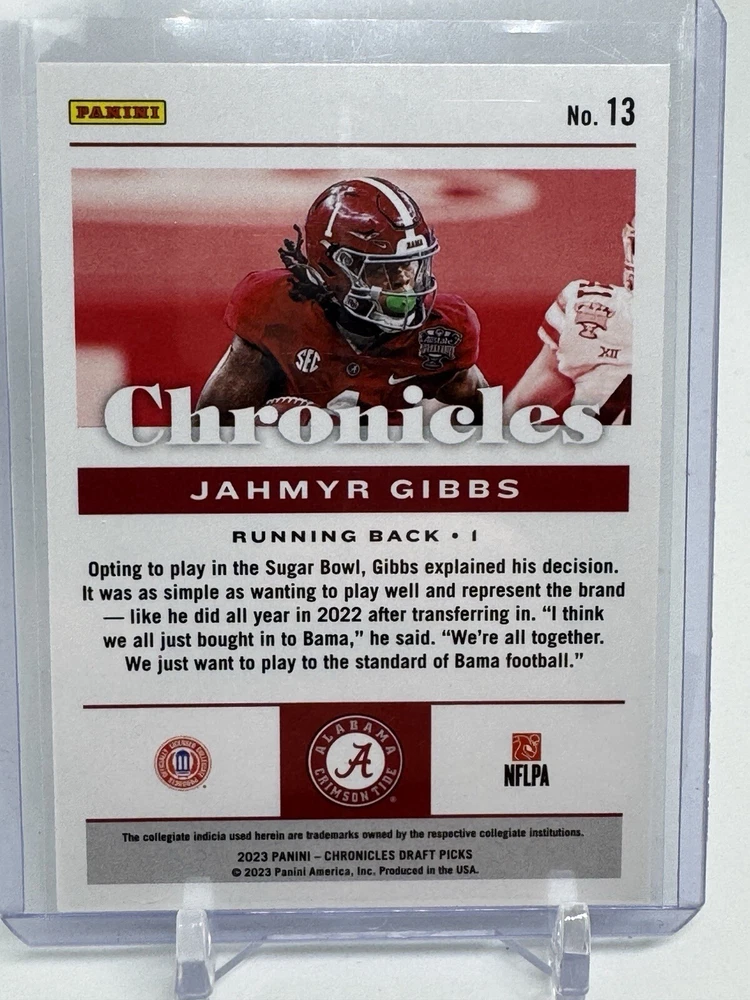 Features: Base Set, Rookie Player/Athlete: Jahmyr Gibbs Manufacturer: Panini Set: 2023 Panini Chronicles Draft Picks Sport: Football Type: Sports Trading Card League: National Collegiate Athletic Association (NCAA) Team: Alabama Crimson Tide Season: 2023 Card Number: 13