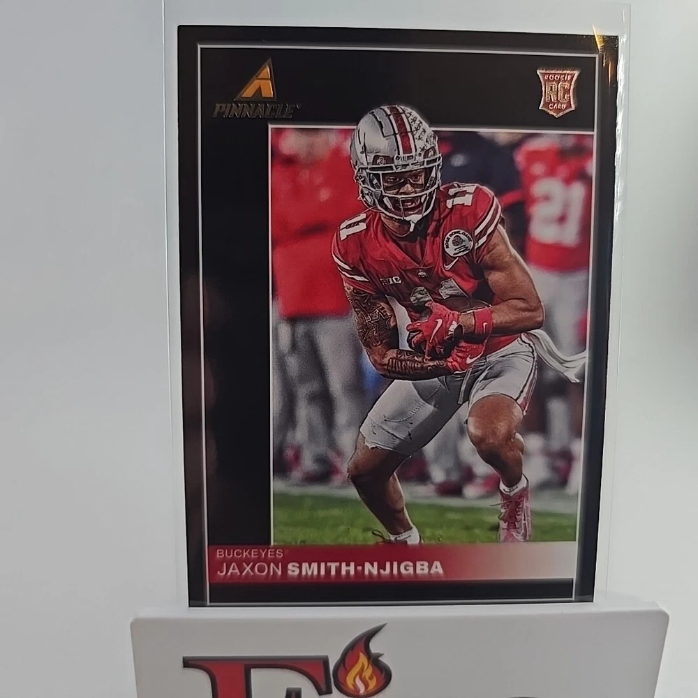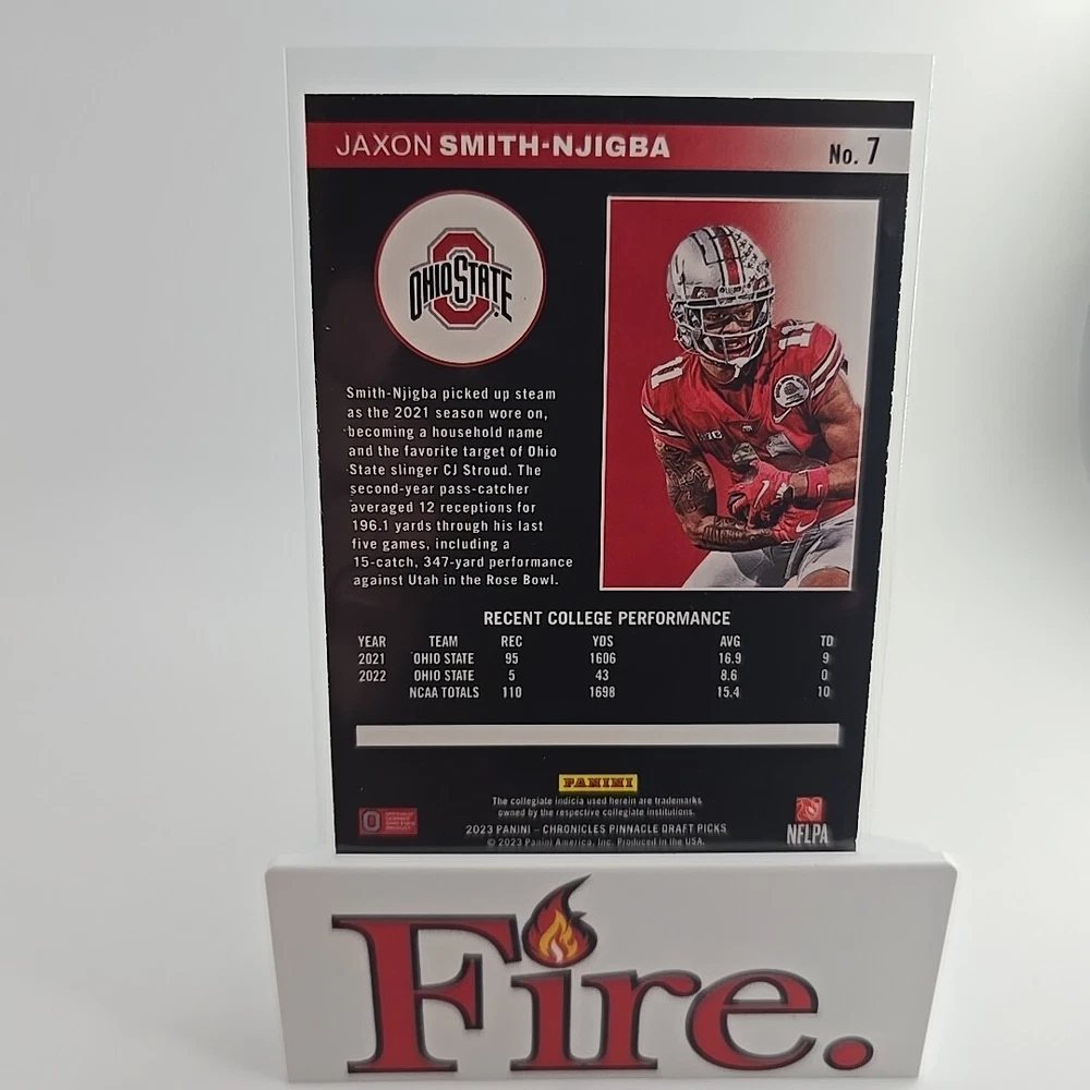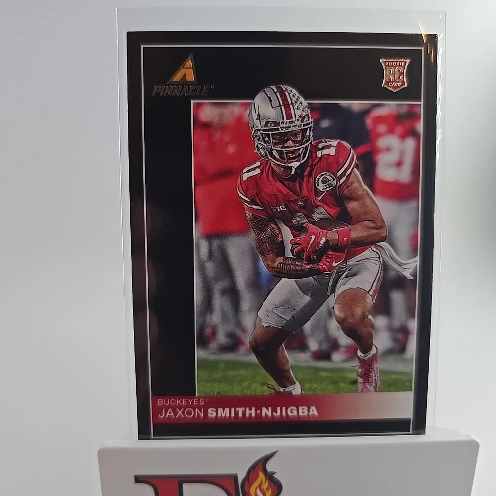 This 2023 Panini Chronicles Draft Picks Pinnacle #7 Jaxon Smith-Njigba (RC) Buckeyes trading card is a must-have for any Ohio State Buckeyes fan. With its standard card size and original print, this sports trading card features the rookie Jaxon Smith-Njigba and is part of the National Collegiate Athletic Association (NCAA) league. The card is not autographed and is an insert in the 2023 Panini Chronicles Draft Picks set. As a collector's item, this trading card is perfect for adding to your sports memorabilia collection. The card features the Ohio State Buckeyes team and is licensed by Panini, a reputable manufacturer of sports trading cards. This card is a great addition to any collection and is sure to impress any sports fan. Thank you for your interest, don't let it get away bid today!