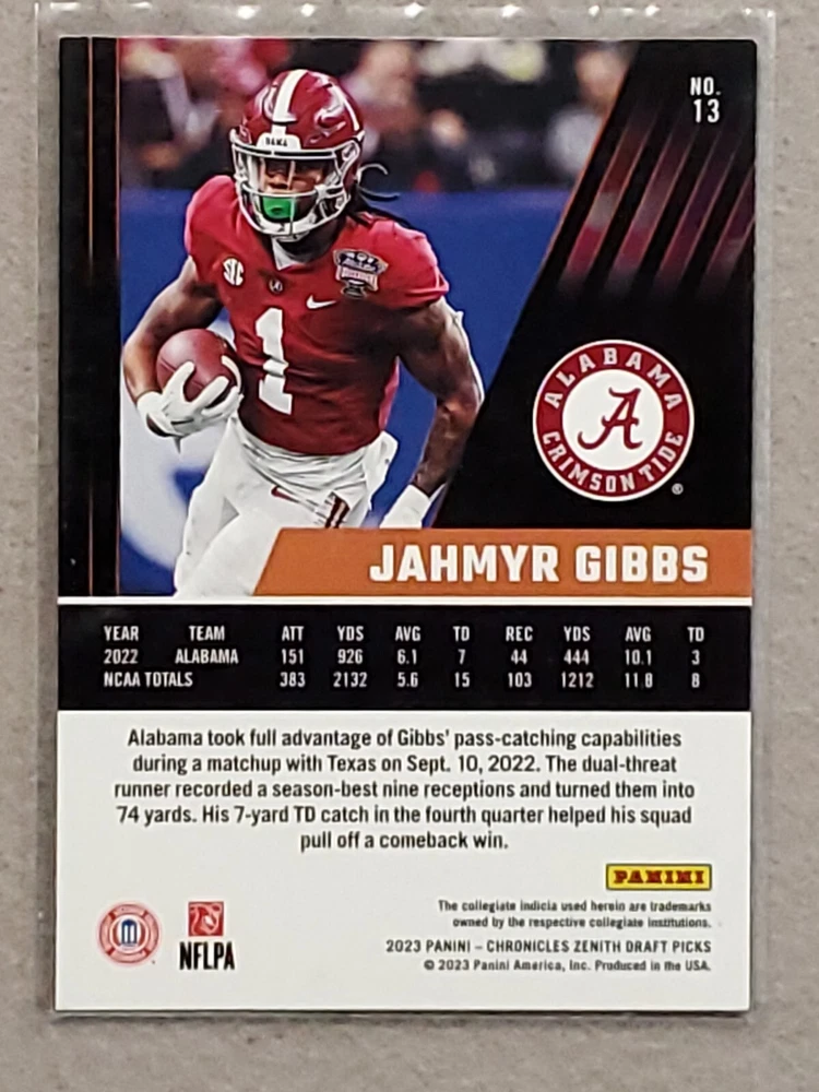 Season: 2023 Sport: Football Manufacturer: Panini Type: Sports Trading Card Team: Alabama Crimson Tide, Detroit Lions Features: Rookie, Insert Player/Athlete: Jahmyr Gibbs Set: 2023 Panini Chronicles Card Number: 13