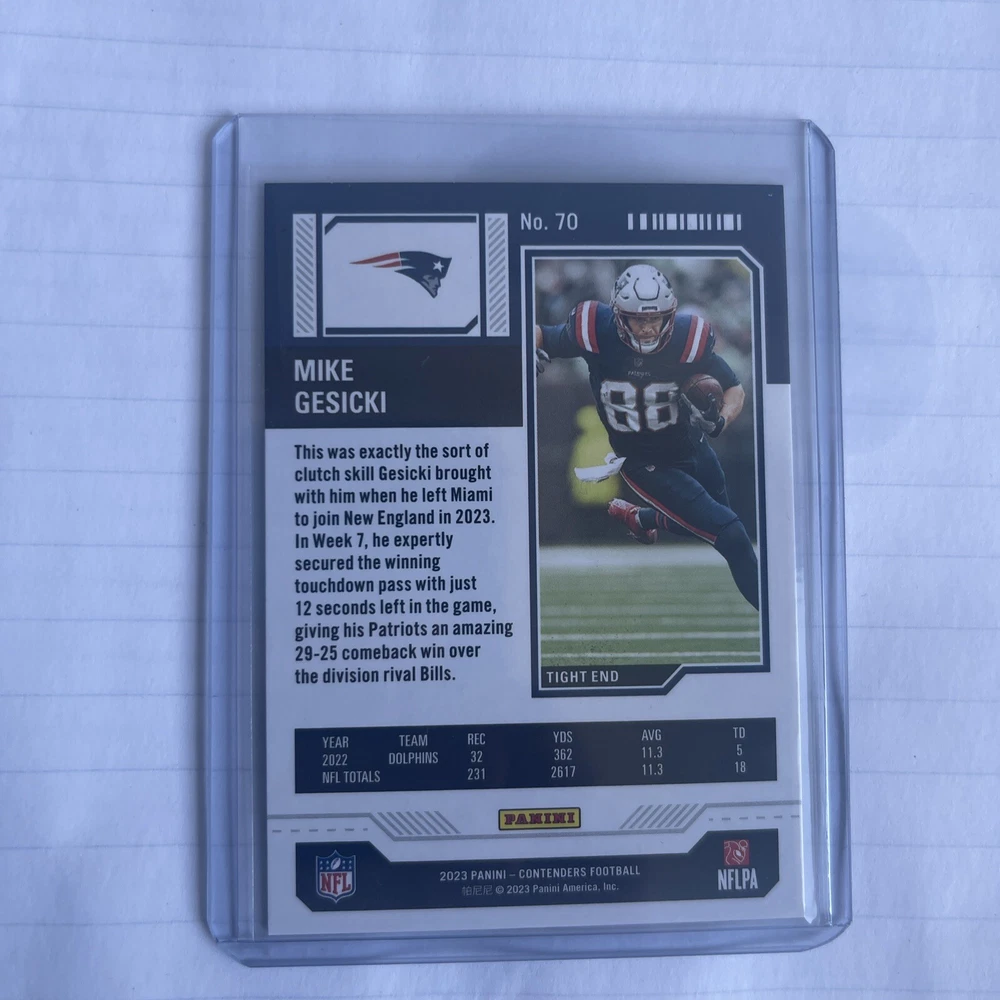 Get your hands on this amazing 2023 Panini Contenders Bronze Game Ticket #70 featuring Mike Gesicki! This rare and highly sought-after trading card is perfect for any sports fan and collector. The card showcases a stunning image of Gesicki in action, making it a must-have for any fan of the Miami Dolphins. With its exceptional quality and attention to detail, this card is sure to impress. Add it to your collection or gift it to a fellow sports enthusiast. Don't miss out on the opportunity to own this valuable piece of sports memorabilia.