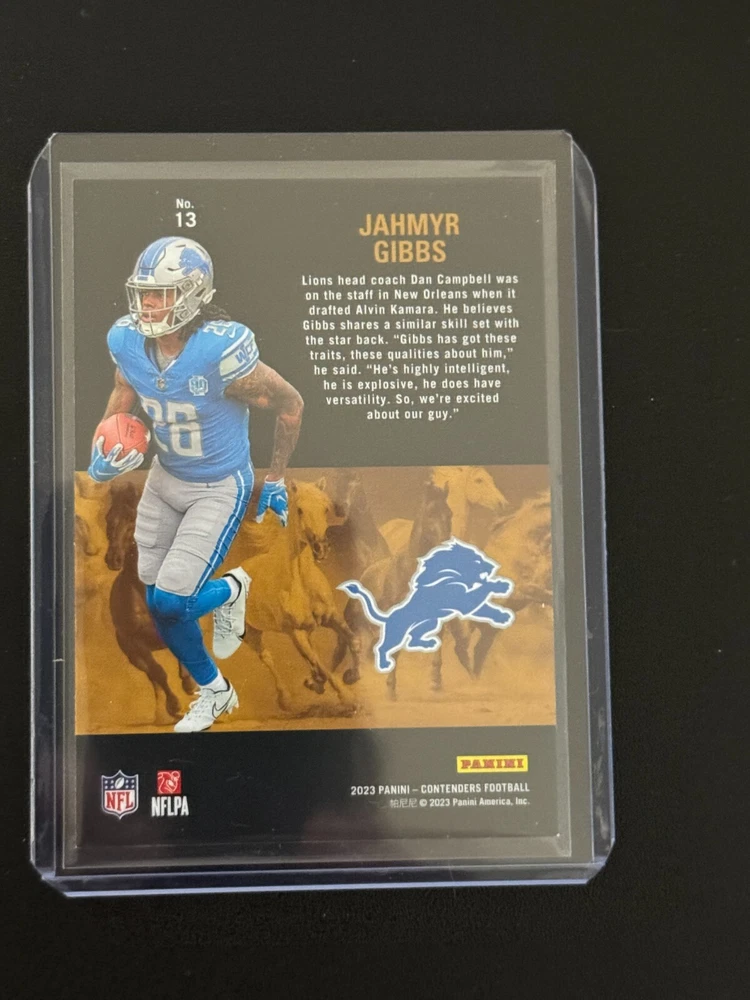 Top right corner may not gem. This is a rare 2023 Panini Contenders sports trading card featuring Jahmyr Gibbs, a rising star in the National Football League (NFL). The card is from the Rookie Stallions insert set and has a print run of only 149, making it a valuable addition to any collection. The card number is 13 and it represents the Detroit Lions team. The card is in excellent shape and has not been damaged in any way. It features a full-color image of Jahmyr Gibbs on the front, along with his name and team information. The back of the card includes his stats and information about the card. This is a must-have for any football fan or trading card collector.