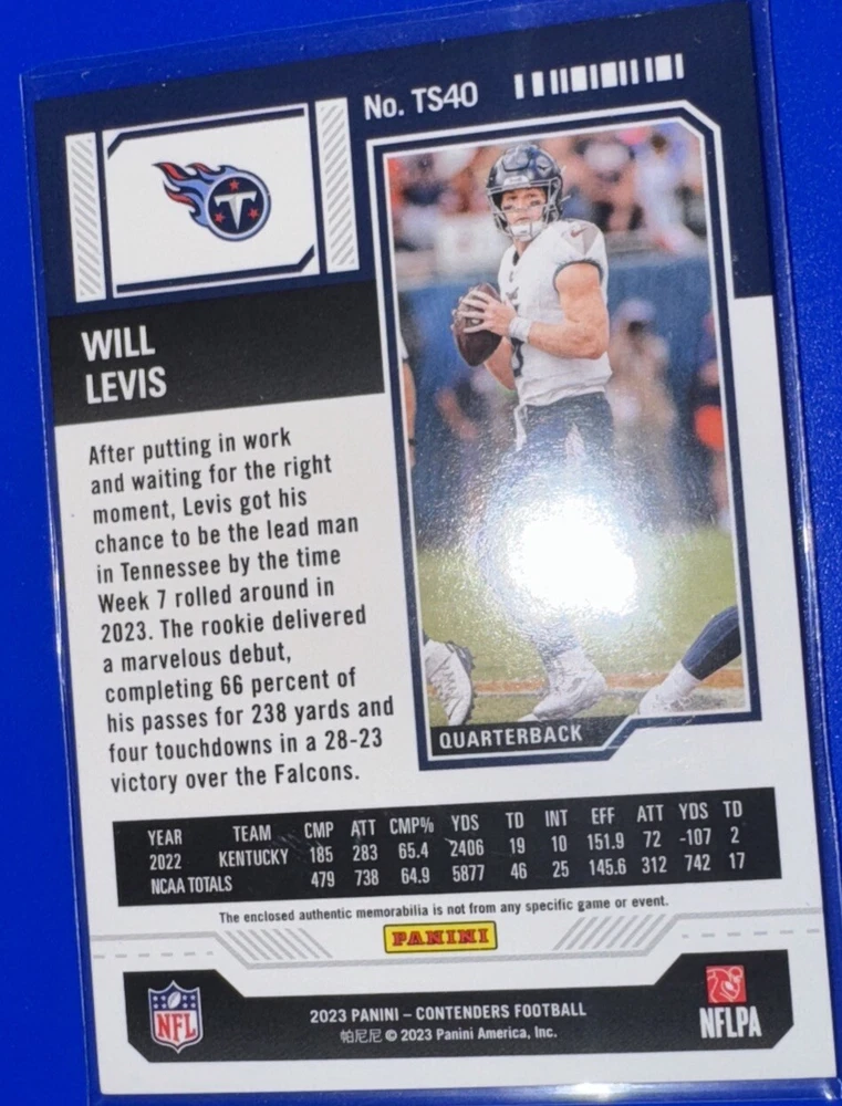 The product is a 2023 Panini Contenders sports trading card featuring a rookie ticket jersey patch of Will Levis, a player from the Tennessee Titans team in the National Football League (NFL). The card is an original and has a card number of TS40. It is a limited edition, exclusive, and short print card with a hologram and a base set feature. The card is made of paper material and is part of the 2023 season.