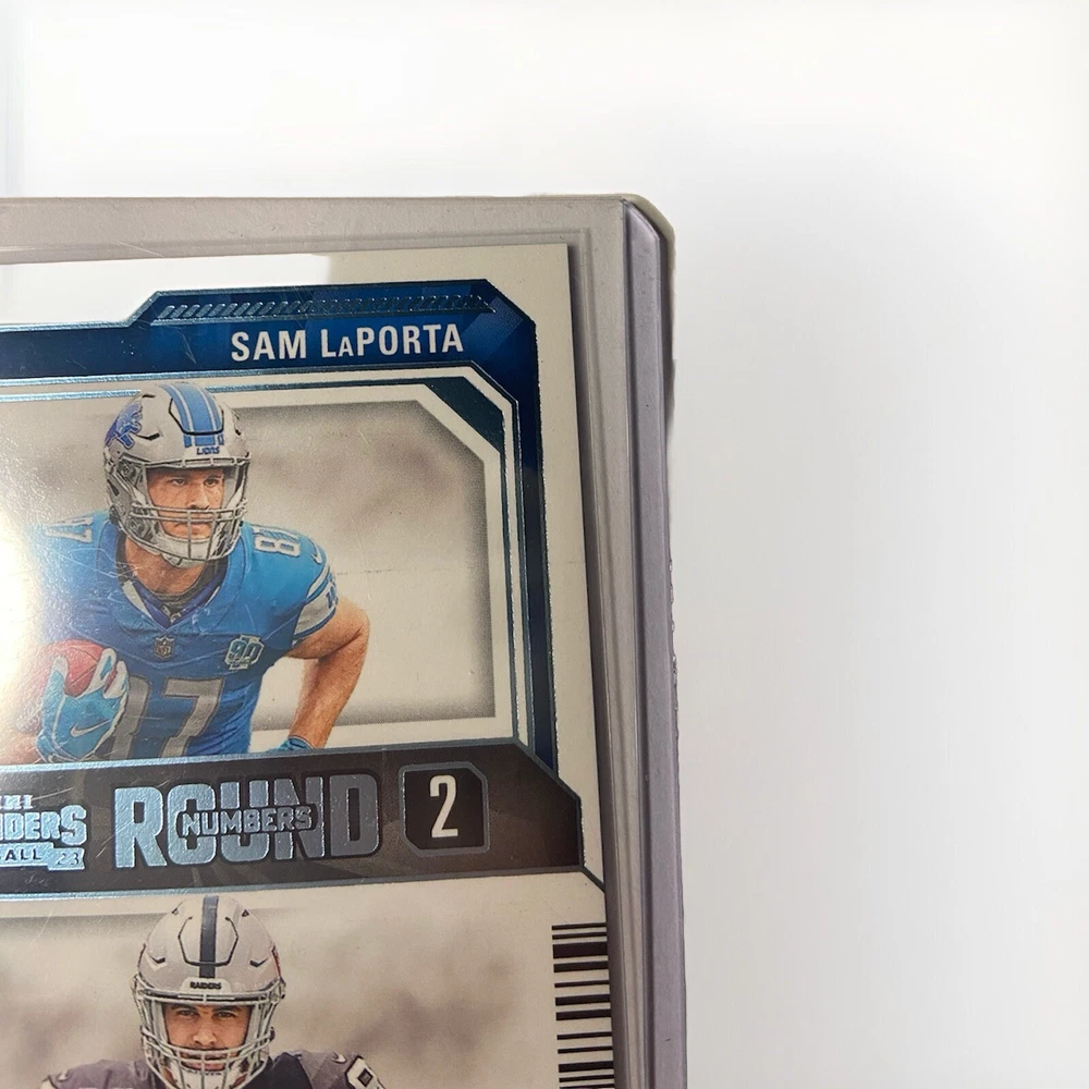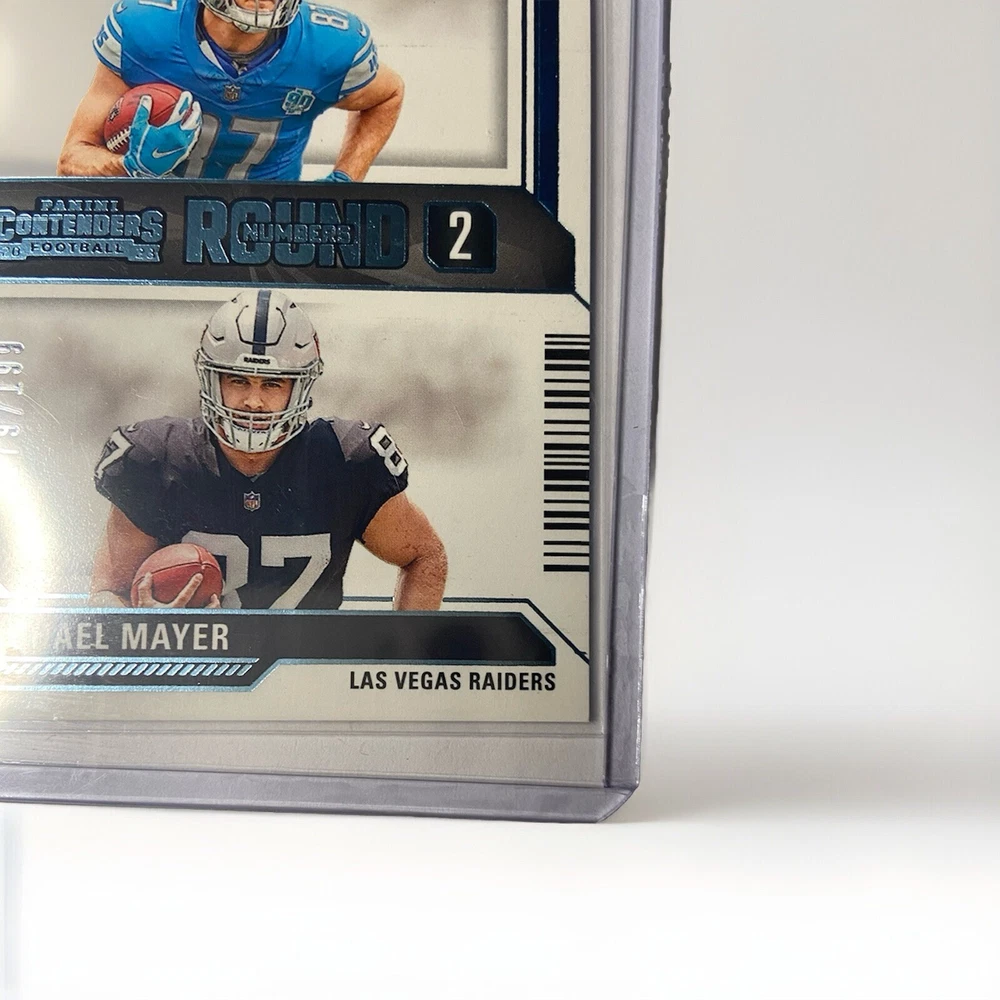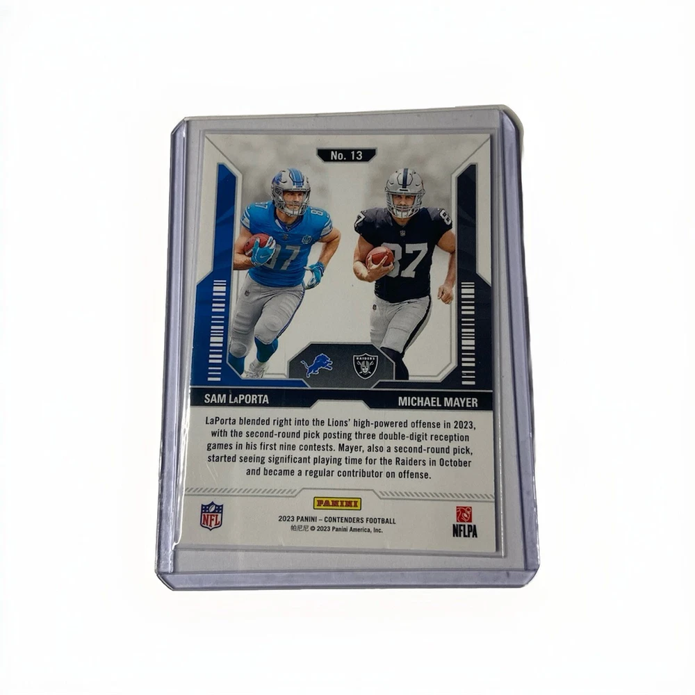 This 2023 Panini Contenders Rookie #13 trading card features Michael Mayer and Sam LaPorta with a print run of 199 Blue Foil. The card is part of the Round Numbers insert set and is serial numbered as a parallel variety. It is a sports trading card for football enthusiasts and is an excellent addition to any collection. The card is manufactured by Panini and is in perfect condition