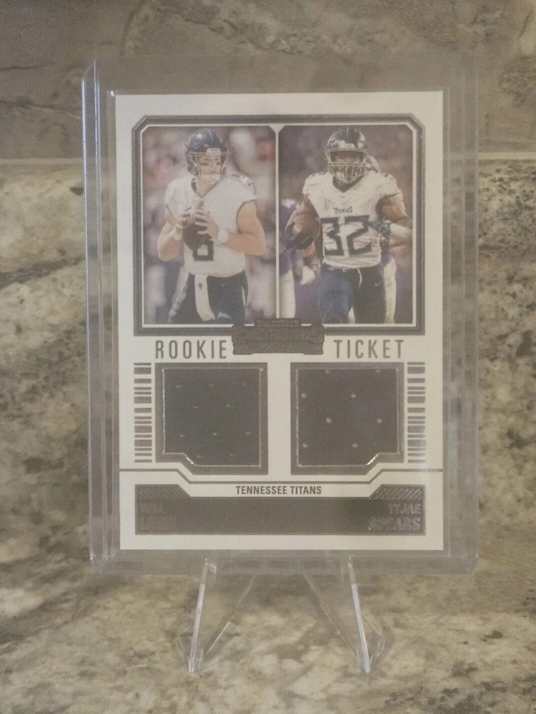 Elevate your football card collection with the 2023 Panini Contenders Will Levis Tyjae Spears Rookie Ticket Dual Patch DS-3 RC. This standout card features both Will Levis and Tyjae Spears, capturing the essence of the dynamic duo from the Tennessee Titans. As a Rookie Ticket entry, it boasts the memorabilia patch that collectors and fans covet. The card is part of the esteemed Panini Contenders set, known for its appealing design and quality. With the card number #DS-3, it's a non-autographed gem that resonates with the NFL's rich history. This piece is an essential addition for those who appreciate the sport's memorabilia and the promising talent of its players.