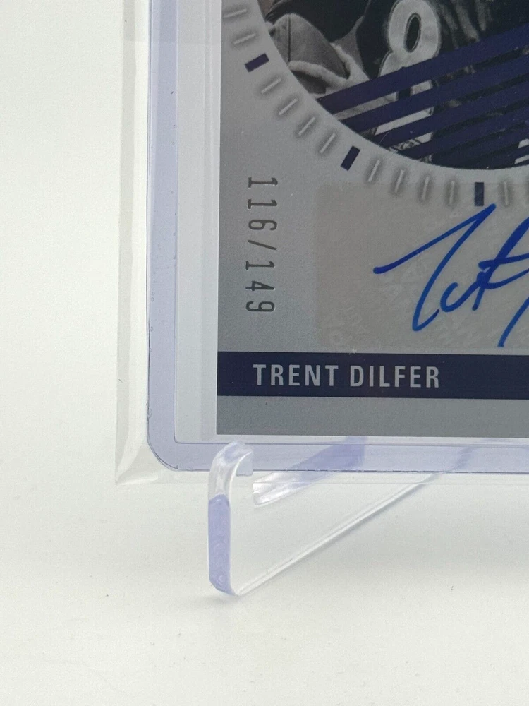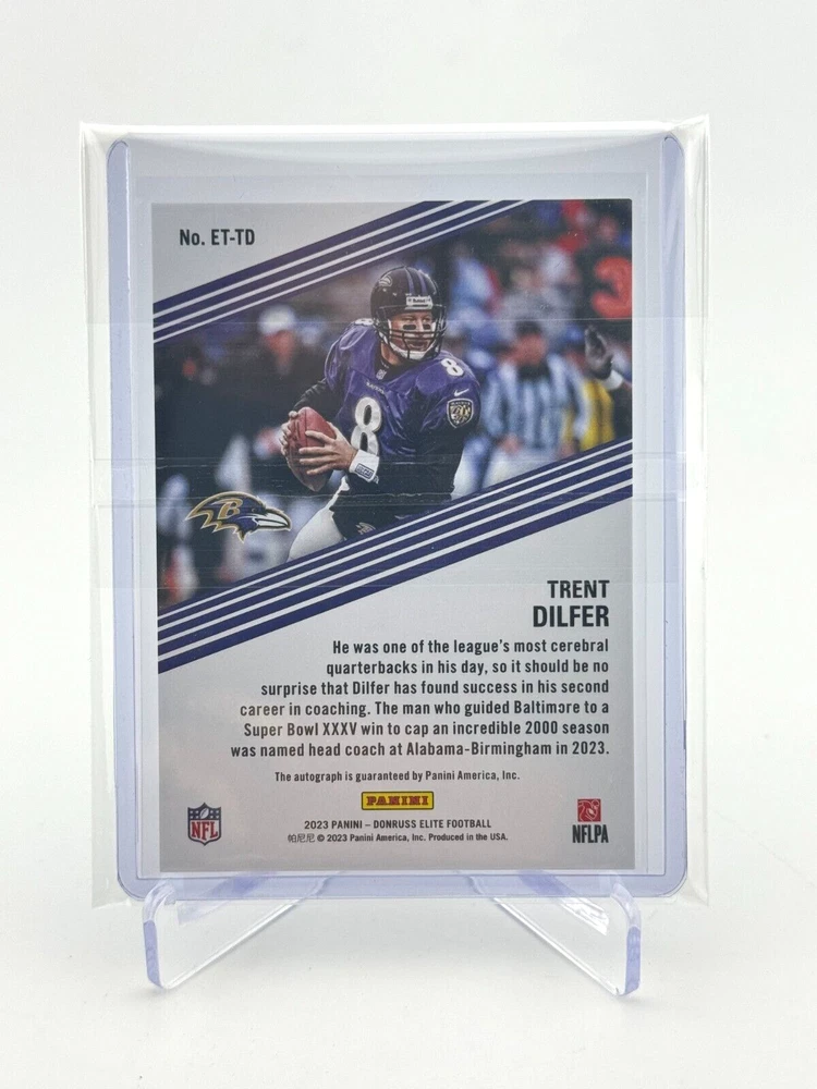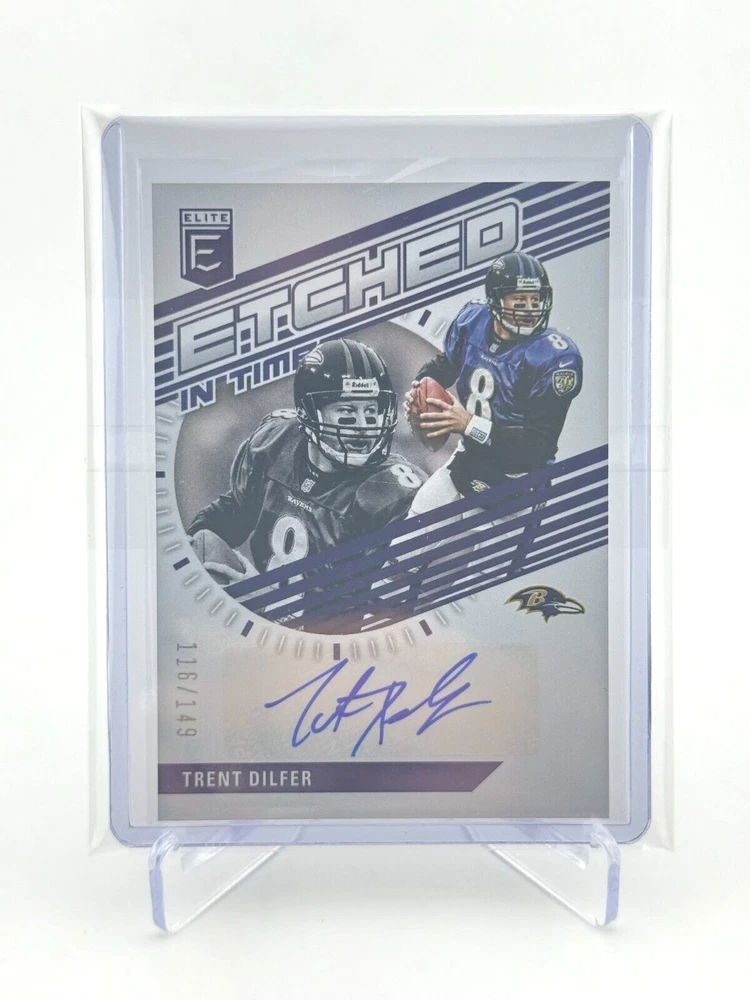 Own a piece of NFL history with this 2023 Panini Donruss Elite Etched in Time trading card featuring Trent Dilfer, autographed and authenticated by Panini. This card is a must-have for any Baltimore Ravens fan and is part of a limited edition set of only 149 cards. The card is made of high-quality card stock, 20 Pt. thick, and has a beautiful design that highlights Dilfer's career. This card is an original, not a reprint, and includes a serial number, making it a valuable addition to any collection. It is also a short print, parallel variety, insert, and has memorabilia, making it an even more unique card. Don't miss out on this opportunity to own a rare piece of sports history.
