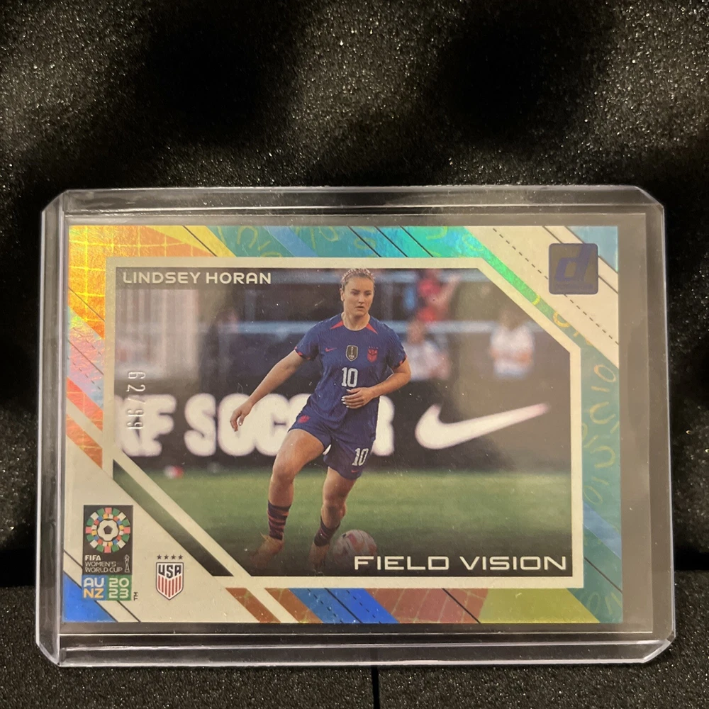 This 2023 Panini Donruss FIFA Women's World Cup trading card features Lindsey Horan from the United States National Team. Part of the Field Vision insert set, the card is serial numbered out of 99 and is in near mint or better condition. Manufactured by Donruss, this sports trading card is a part of the 2023 Panini Donruss FIFA Women's World Cup collection, showcasing Horan's field vision on the pitch.