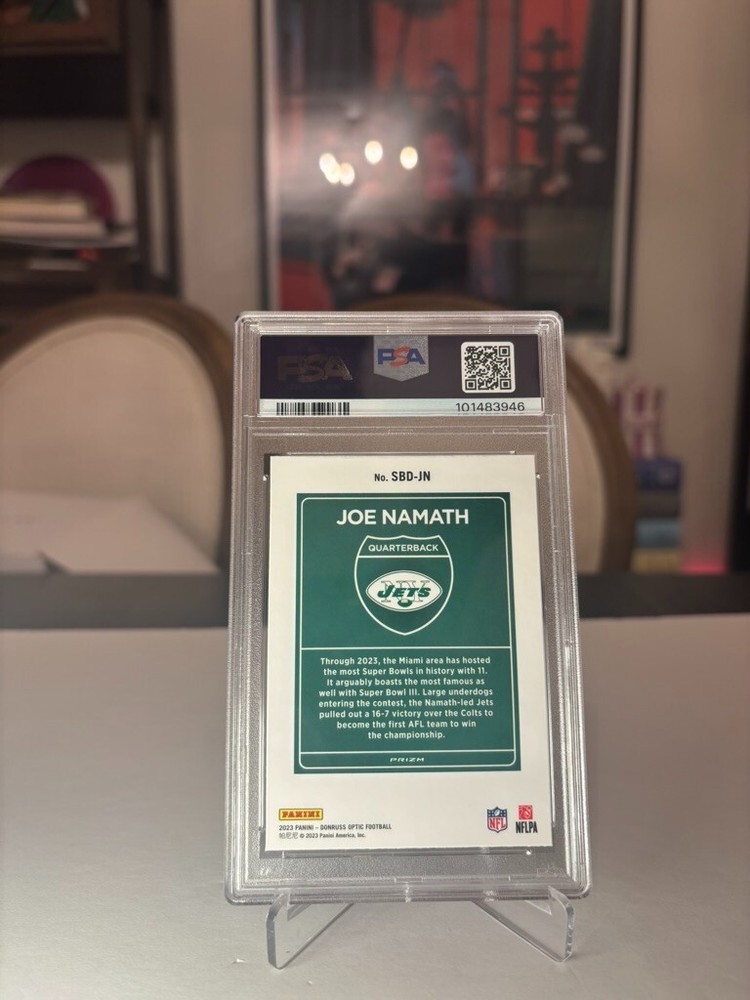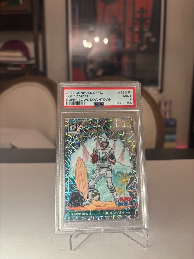 Capture a piece of football history with the 2023 Panini Donruss Optic Super Bowl Downtown card featuring the legendary Joe Namath of the New York Jets. This highly coveted insert from the Super Bowl Downtown set showcases the prowess of one of the NFL's iconic quarterbacks, immortalized in the form of a collectible card. With its meticulous design and quality finish, the card celebrates Namath's legacy in the sport, making it a standout addition to any collection or a treasured gift for the avid football fan.