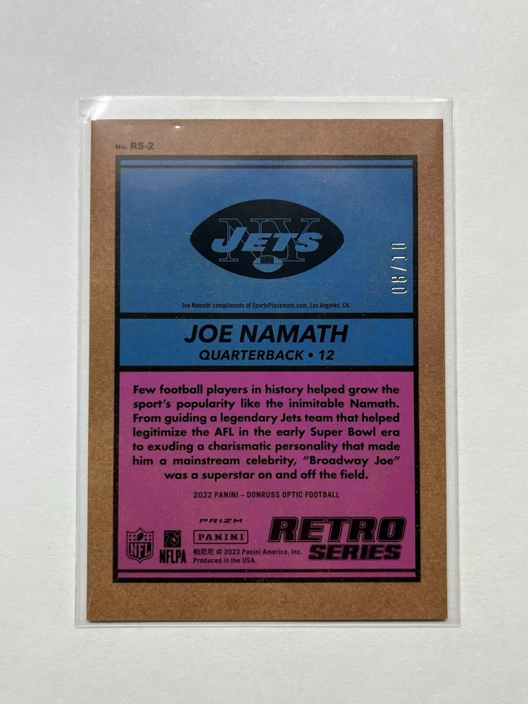 This rare and valuable 2023 Panini Donruss Optic #RS-2 Joe Namath Retro Series Gold #08/10 card is a must-have for any serious football fan or sports trading card collector. Featuring the legendary quarterback Joe Namath in his New York Jets uniform, this card is a stunning addition to any collection. With its gold prizm parallel/variety and serial number, this short print insert card is a true gem. The card is from the 2023 Panini Donruss Optic set and is not autographed. As a fan of the National Football League (NFL), this card is a great way to show your support for one of the greatest players in football history.