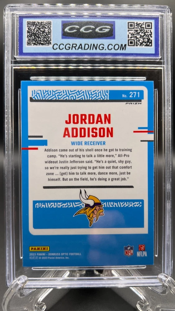 This trading card features Jordan Addison, a football player, in his 2023 rookie season. The card is from the Optic parallel/variety and is graded a perfect 10 by Professional Sports Authenticator (PSA). The "Purple Shock" color match adds a unique and eye-catching element to the design of the card. This collectible item is ideal for fans and collectors interested in sports trading cards, specifically those focusing on football and rookie players like Jordan Addison.