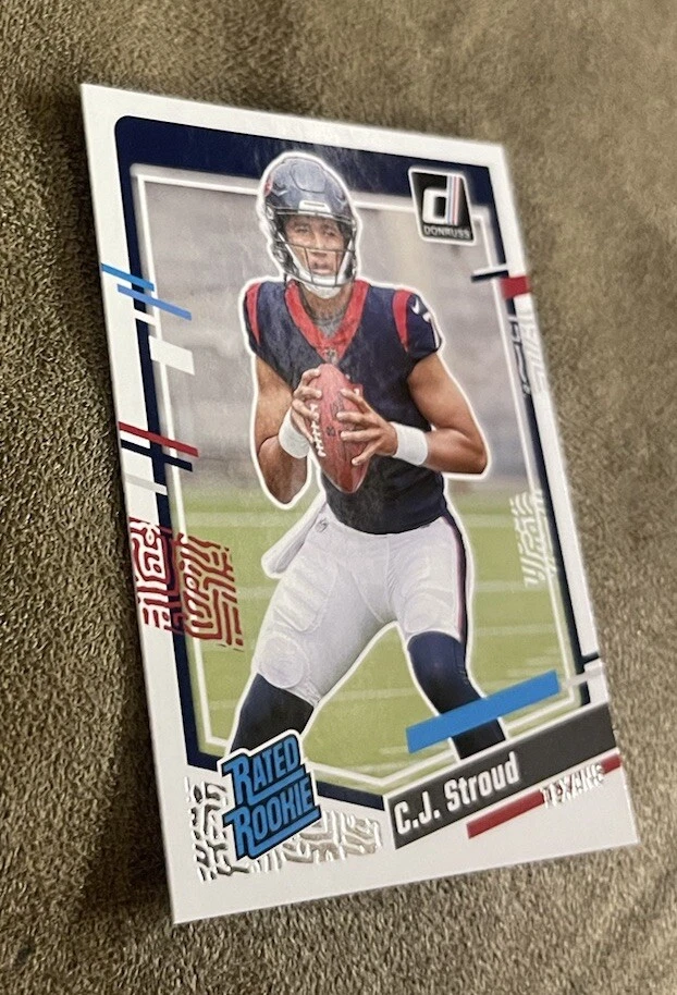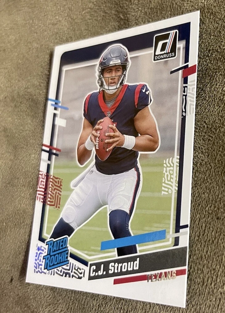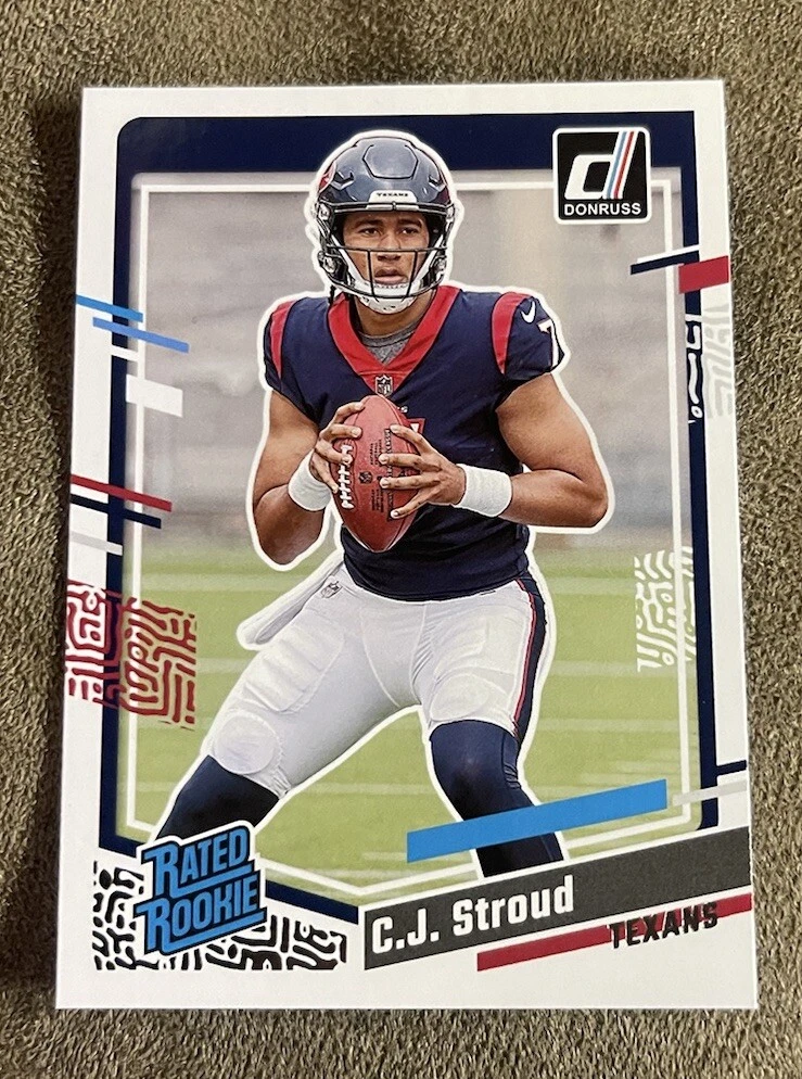 Card Number: 339 Type: Sports Trading Card Sport: Football Set: 2023 Panini Donruss Autograph Authentication: Donruss Year Manufactured: 2023 Player/Athlete: C. J. Stroud Season: 2023 Features: Parallel/Variety, Base Set, Rookie Team: Houston Texans Parallel/Variety: Aqueous Test Manufacturer: Panini Autographed: No League: National Football League (NFL)